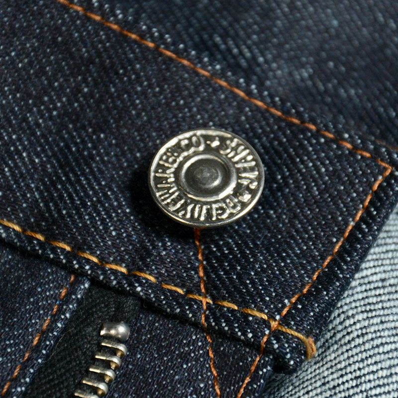 日本デニムの産地、岡山県井原市の旧式シャトル織機で製造した16オンスデニム。経糸にアメリカコットンによる濃紺インディゴ6番糸、緯糸に同じくアメリカコットンによる7番キナリ糸を使用し、高密度によって高オンスに仕上げたハリとコシが強いオリジナルデニム。濃淡ハッキリした経年変化を好む方はこのデニムがオススメ。