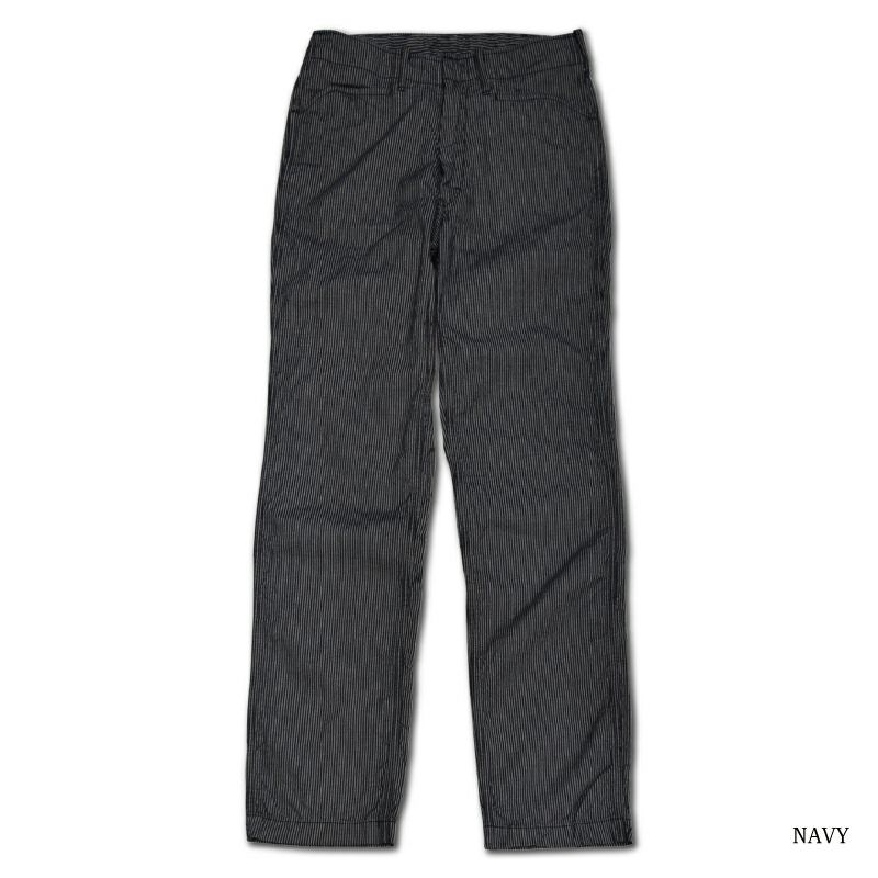 旧式ドビー織機によりオリジナル製造したこの生地は、縦糸にコットン・横糸にレーヨンを使用した特殊な生地。また、細めのストライプ柄もクラシカルな雰囲気を演出してくれます。この型紙は、当時のカウボーイの正装をモチーフに若干の余裕を持たせています。股上も深めですのでクラシカルな装いに相性抜群です。