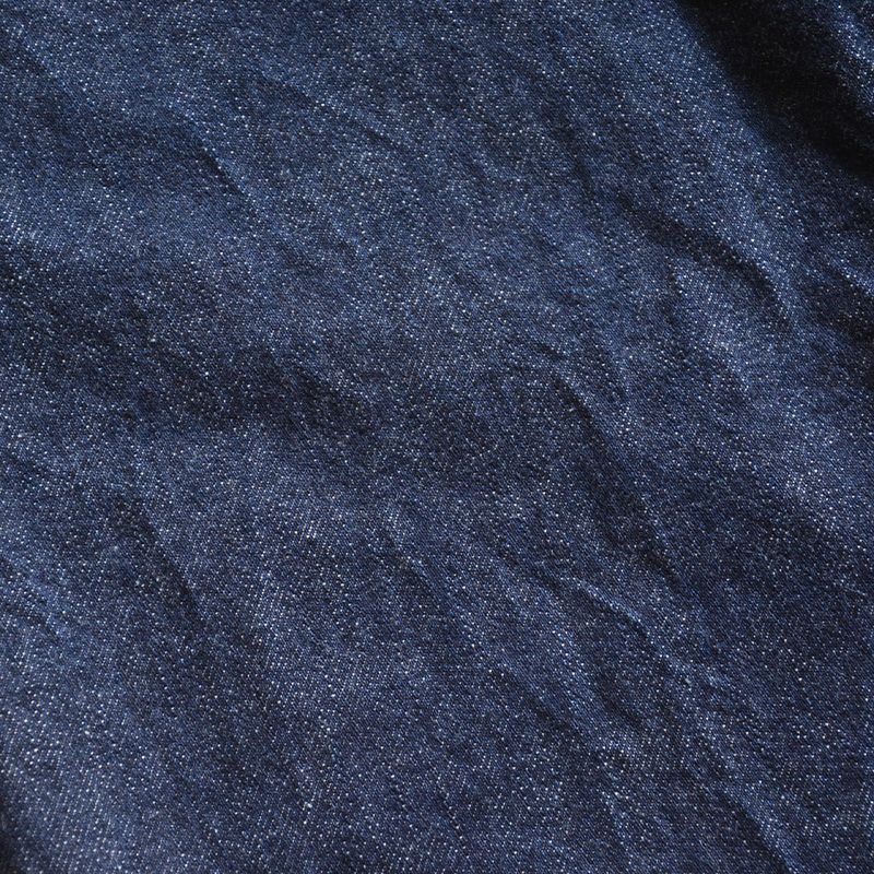 岡山の旧式力織機で独自開発したデニムです。レプリカデニムと呼ばれる業界ですが、このデニムは「再現デニム」と自負しています。アメリカメンフィス綿と若干の炭を加えたインディゴ、独自の糸形状、ジャガイモやトウモロコシから作る澱粉糊、そして織り上げ後の生地焼き入れなど、1940年を再現した素材・工程・気候によりリアルなヴィンテージキバタデニム素材です。