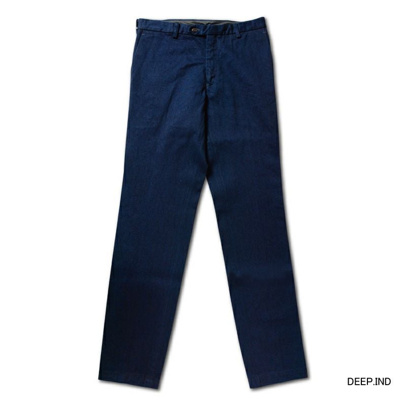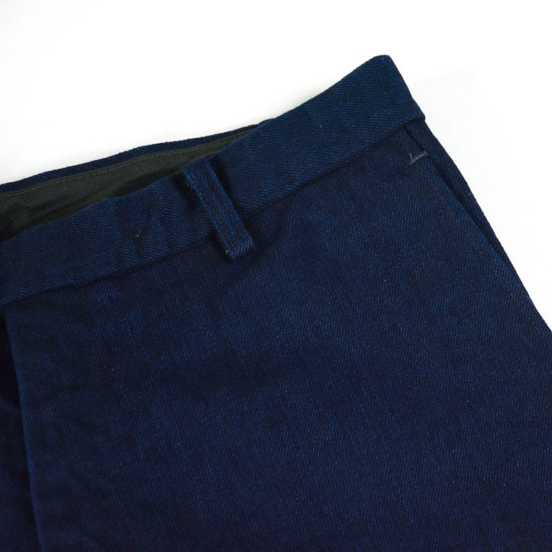 岡山県井原の旧式力織機で製造したこの素材はインディゴロープ染色糸を経緯糸に打ち込むことで濃紺インディゴ色を創っています。