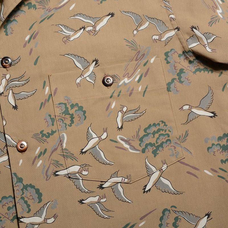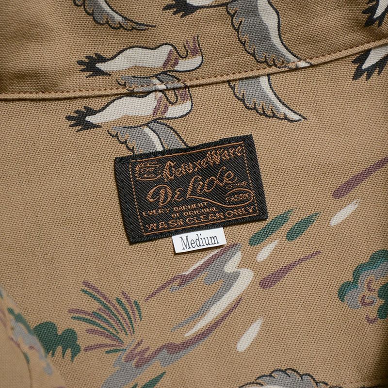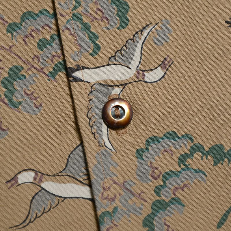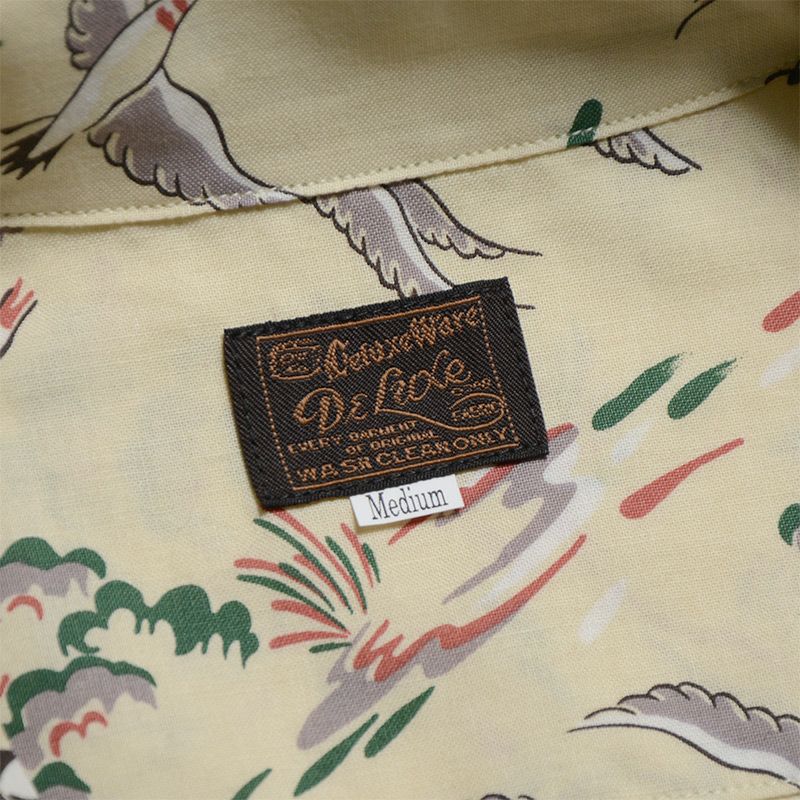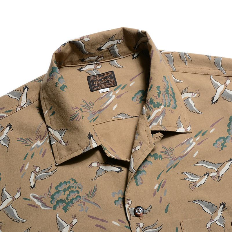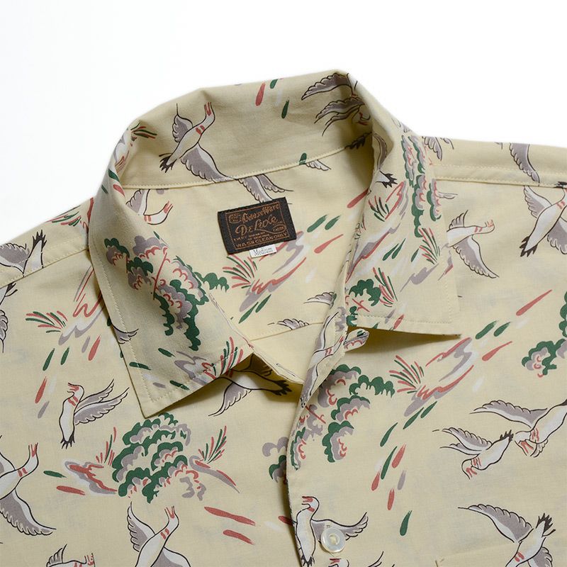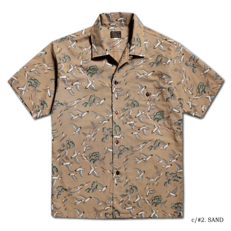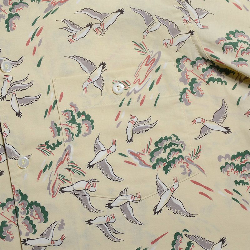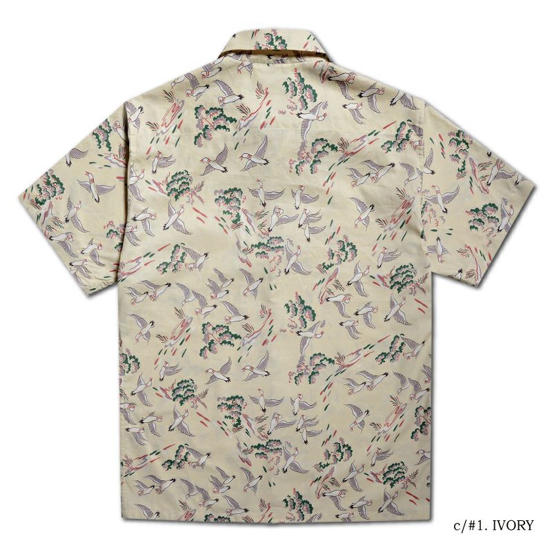 兵庫県西脇の旧式織機を使用し製造したファブリックと2色+抜染で創り上げたコットンハワイアンシャツ。1950年に実在したデザイン柄をハワイアンに転用したため、まるでヴィンテージさながらの風合い・表情に仕上がりました。また、風や水が通過するスルーファブリックのため涼しく扱い易い機能性も魅力です。