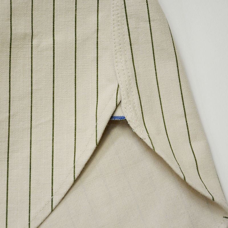 岡山県井原市の旧式織機にて製造したダック素材は、経糸に7番糸、緯糸に6番糸というデニム同様の太糸を使用し高密度組織で織り上げることで強いハリとコシを生み出し、ストライププリントで仕上げた在りそうで無かったプリントキャンバス素材です。