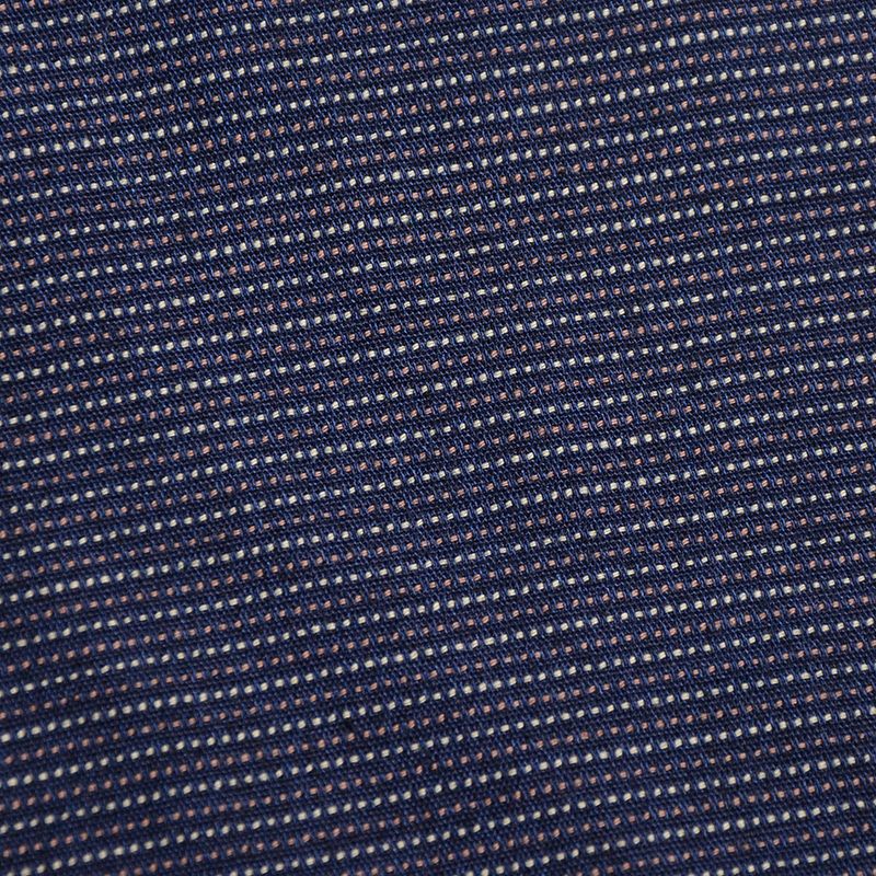 この素材は、岡山県井原市の旧式織機で織り上げた10オンスインディゴファブリックです。経糸にムラ糸による12番糸を張り、緯糸には30番糸を打ち込んで製造した平織デニムに広島県福山市で着色抜染プリントしました。手書きしたドットにより、不揃いな形状と並びがヴィンテージの表情を創っています。また、兵庫県西脇市で製造したピンドットインディゴファブリックは、平織インディゴ糸の中に赤、青、白を織り込んだ柄織ファブリックです。