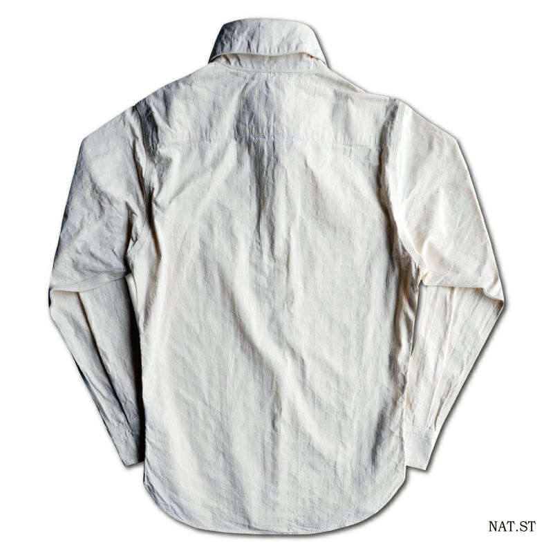この商品は産地兵庫県西脇の旧式シャトル織機による高密度コットン100%素材を使用したオリジナル素材で、経緯糸共に20番単糸を100本を超える高密度で打ち込むことで製造するこのファブリックは、白、インディゴ共に生地に独自の張りとコシ、シャリ感が生まれます。エリの高さを出しボタンダウンで仕立げた「エリに特徴を持つシャツ」として製造していますまた、1920年の懐中時計ポケット、緩やかなウエストライン、前後差を付けた立体形状により動き易さを追求したシャツです。