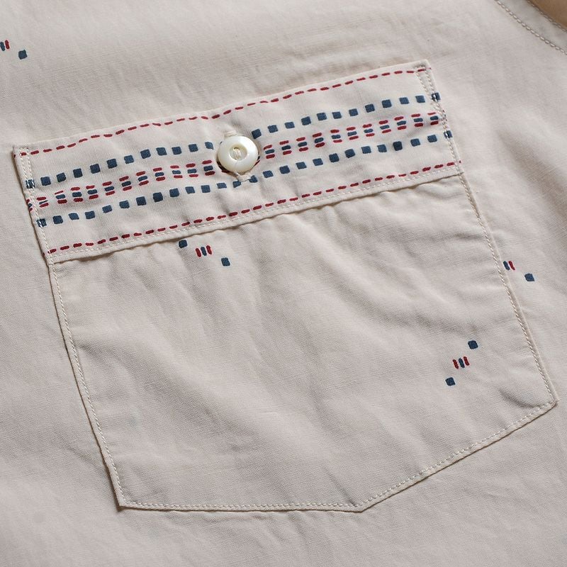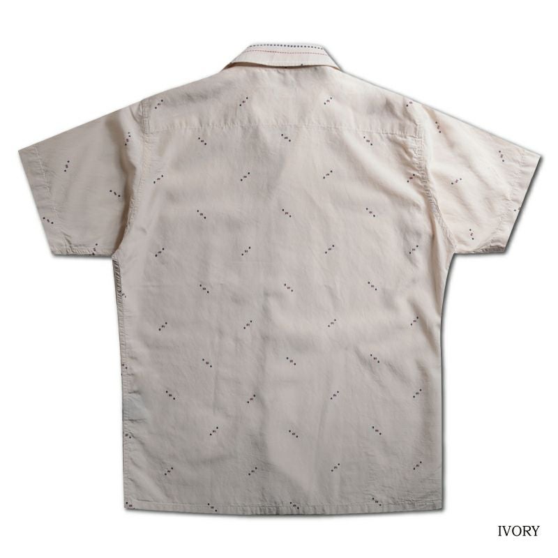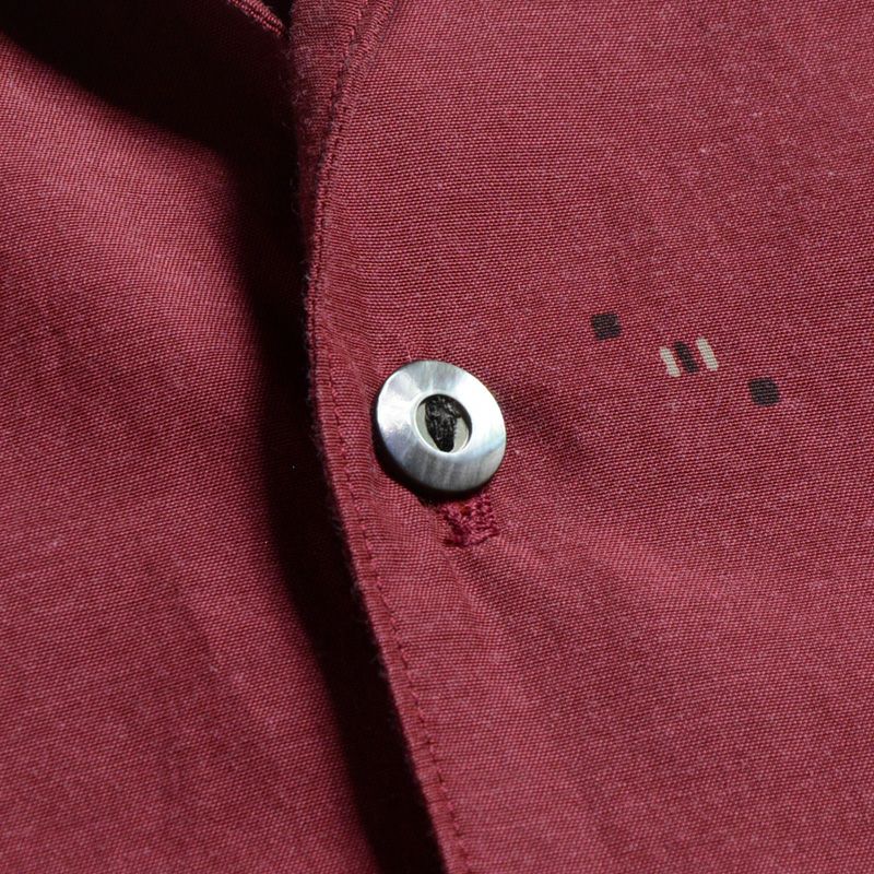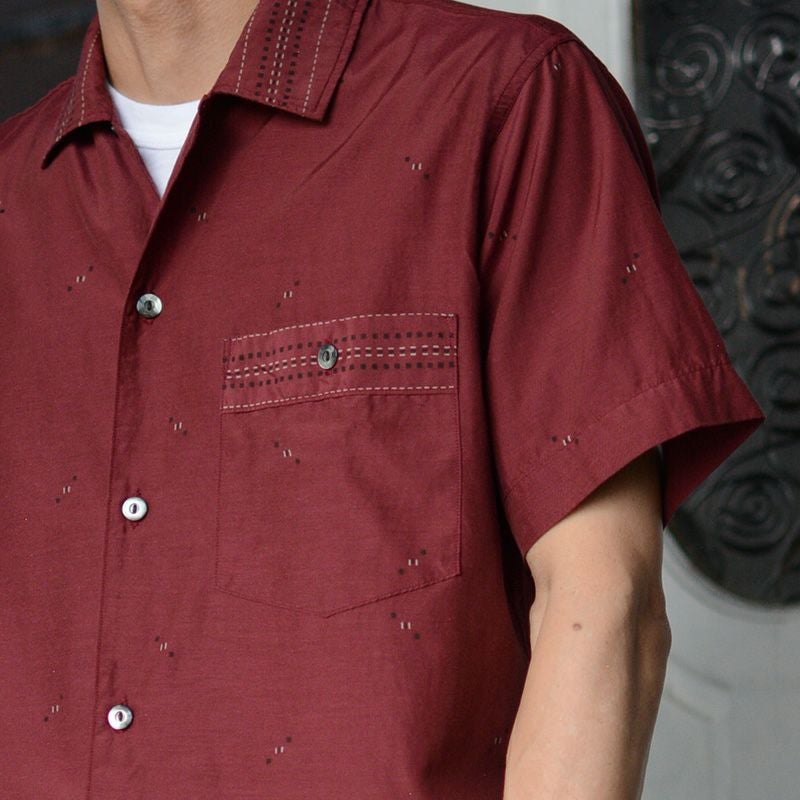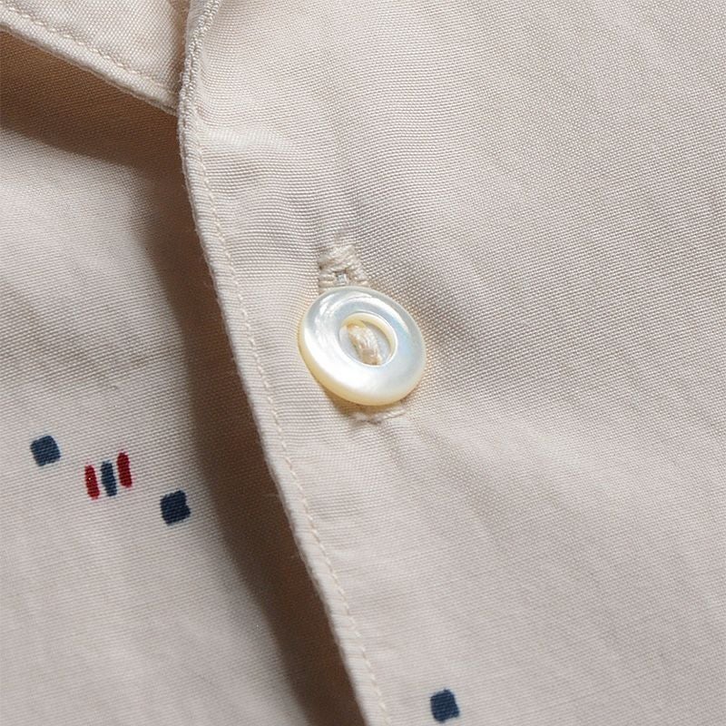 福井県福井市の旧式織機から生み出した唯一無二の生地素材と京都職人の手捺染を駆使したレーヨンシャツ。1950年の渋いレイル(鉄道)ドットが大人のデザインを感じさせ、着込む程にドレープ感に変わる経年変化も楽しみの一着。