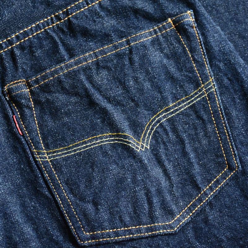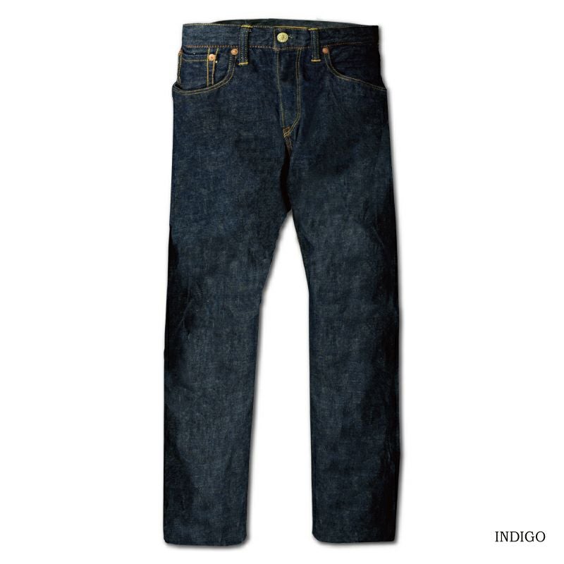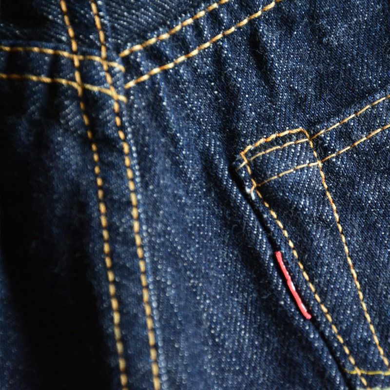岡山県井原でオリジナル製造した13.6オンス中紺インディゴデニム。アメリカメンフィス綿とトウモロコシから抽出した澱粉糊を使用し、旧式力織機で織り上げた後にデニム生地を「オーブンで焼き上げる」など変わった工程方法にて製造した特殊オリジナルデニム。1940年当時の同原料、気候の表現、同ミシン設備そして同ディティールにて製造することから「再現デニム」と呼び、当時の偶然かつ必然的な環境をも現代方法を駆使し再現した現代ヴィンテージジーンズです。ヴィンテージのようなブルージーンズを目指す方には特におすすめです。