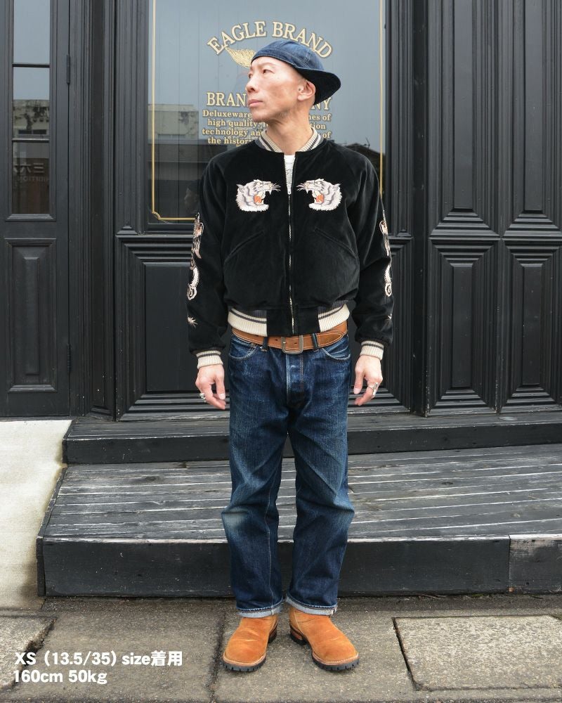 デラックスウエア初となるスーベニアジャケット(スカジャン)。刺繍機を用いて8か所に刺繍を施し、まるで職人が横振り刺繍で仕上げたような品質に迫った1着。本物の素材や刺繍糸の使用はもちろんのこと、刺繍部分を手で触り、生地素材と同等の柔らかさがあることがデラックスウエア品質の条件です。生地素材と共に刺繍も経年変化する本物品質を目・手触り・着心地で確認下さい。