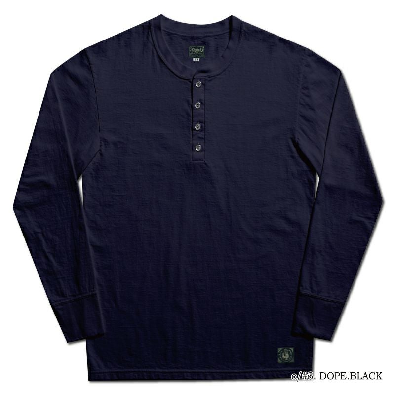 単純に首元が開き、ボタンで留める仕様をヘンリーネックと呼びます。しかし、その仕様に実は細かな違いがあることで各社企画製造する内容が異なる商品でもあります。首元の前立て(開き位置)長い仕様、ボタンの数が多い少ない、付け合わせのエリ形状が丸い四角など1900年代当時から多くの種類により愛されてきた仕様ではないでしょうか。我々ダリーズ&コーのヘンリーネックは、緻密な創り込みから生む見た目のスタイルが一つの売りになっています。首元の前立てを重ねる際におよそ1度ほどの角度を付けて合わせること、ボタンの位置のバランスとエリ先の形状で着用した時に少しエリ先が広がること。言葉にして初めて「そうか」と感じる内容ですが「着るとなんかいいね」と感じて頂くには細かな仕様の積み重ねが大事なのです。