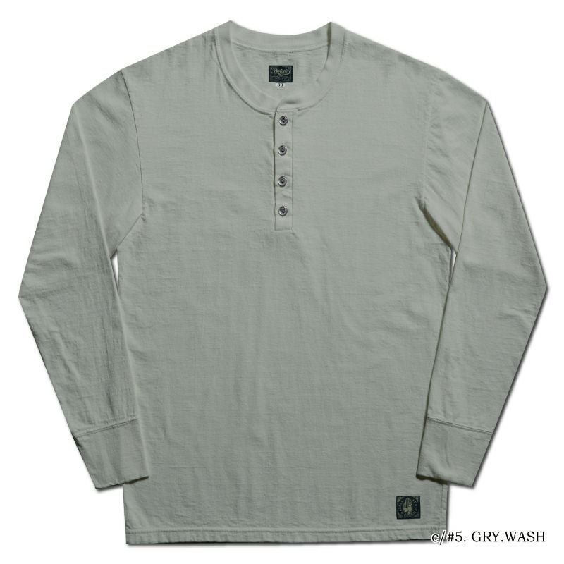 和歌山の旧式吊編機により、ゆっくり空気を含みながら編み上げたオリジナルの丸胴生地。編糸表面をガスバーナーで焼き、毛羽を焼却したガス焼き天竺素材が特徴です。絶妙な色合いと至高の着心地・手触りがクセになる長袖Tシャツ。1920年のワーカーに愛されたヘンリーネックをスタイリッシュにリプロダクト。