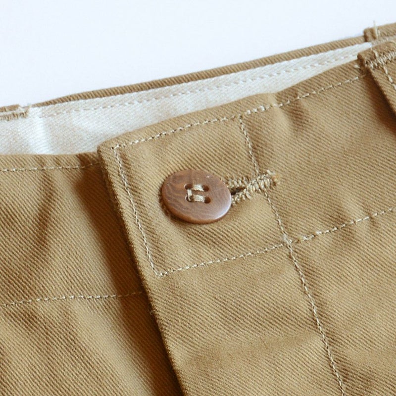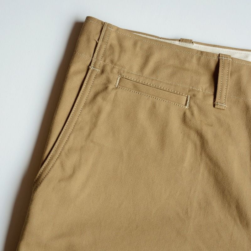 アメリカコットン強撚14番と16番糸による高密度チノクロス。およそ100本の織り密度はヴィンテージクオリティを遥か凌ぐ。