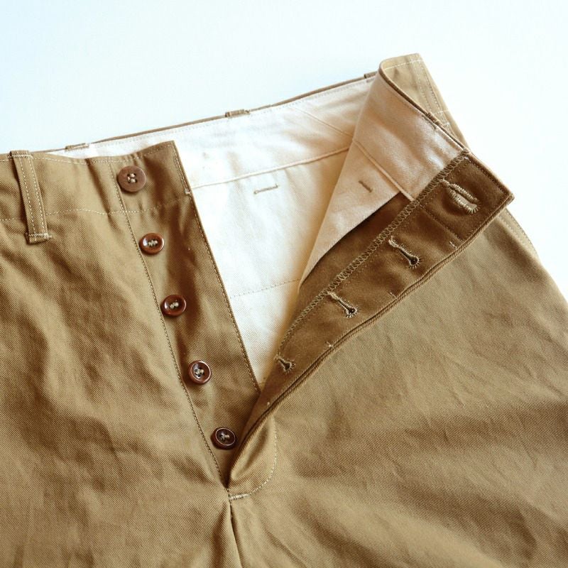 ミリタリー生まれのヴィンテージチノパンは、創られた年代によりカタチや創りが異なります。どれが良いかは其々の趣味趣向により異なるでしょうが、余りに沢山のヴィンテージチノパンを見比べていると必ず頭の中で融合が成されるはずです。「これがこっちについて、この創りがこっちに・・・」これを現実的に実行したチノパンが946Aです。リアルなヴィンテージレプリカ品とは異なるけれど、ヴィンテージ特有のディティールと設備・創り、そして品質を大きく高めた素材により新たな存在を生み出しました。このチノパンの誕生は本物と理想が交差する古くて新しいオリジナルの物語となりました。