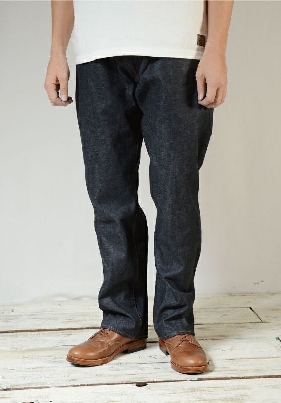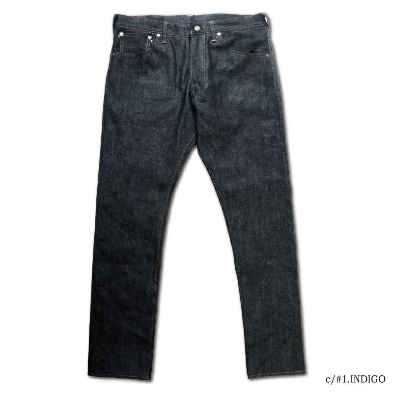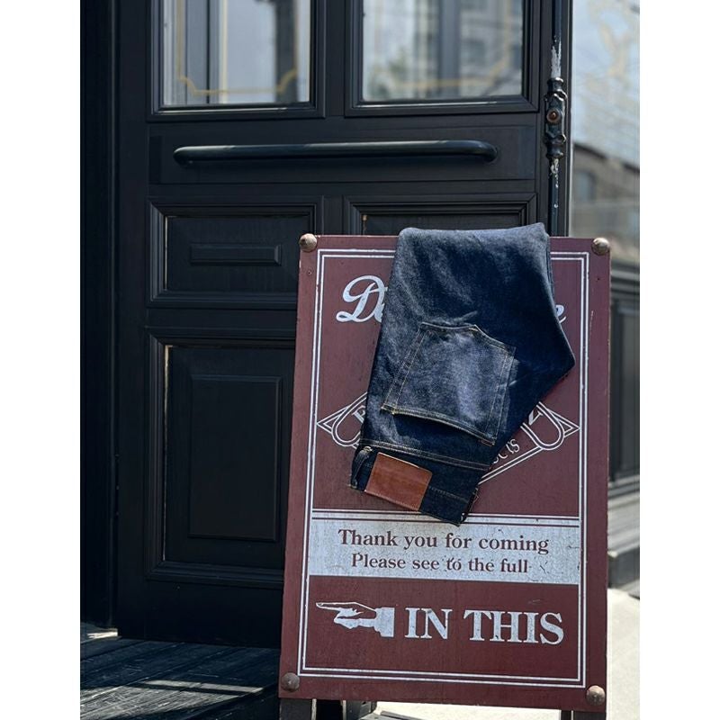 岡山県井原でオリジナル製造したデラックスウエア初となる高オンスデニムを使用した最も細いスリムストレートジーンズ。立体形状の型紙によるシルエットと16オンスデニムを持って、濃紺かつシャープなメリハリの経年変化が楽しめるジーンズに仕上がりました。またレギュラーステッチと呼ぶミシンワークにより、デニム素材とステッチの一体感有る創り込みも特徴です。