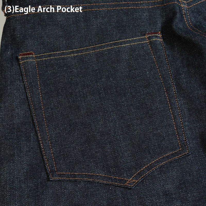 ジーンズの顔となるバックポケット。ヴィンテージジーンズと同じく外周から内周へと一筆で縫い上げる。絶妙な曲線とステッチ間がセンスの見せ所。イーグルアーチポケット。