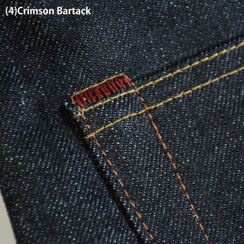 拘りのデニムを見分けるコツはバータックを確認する。ポケットと身生地の段差を平らに仕上げる技が強度を生み、長い着用に耐久する。クリムゾンバータック。