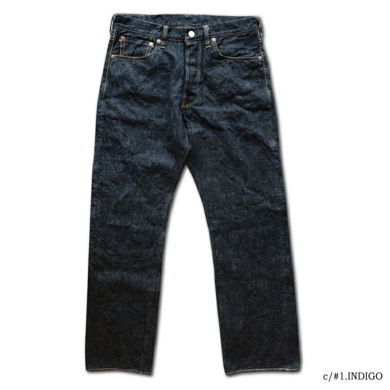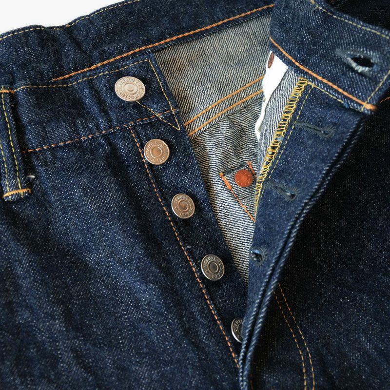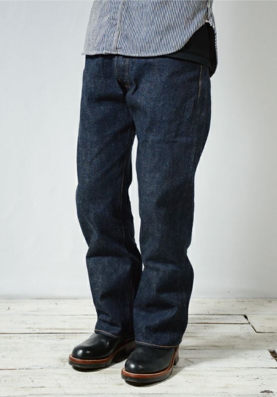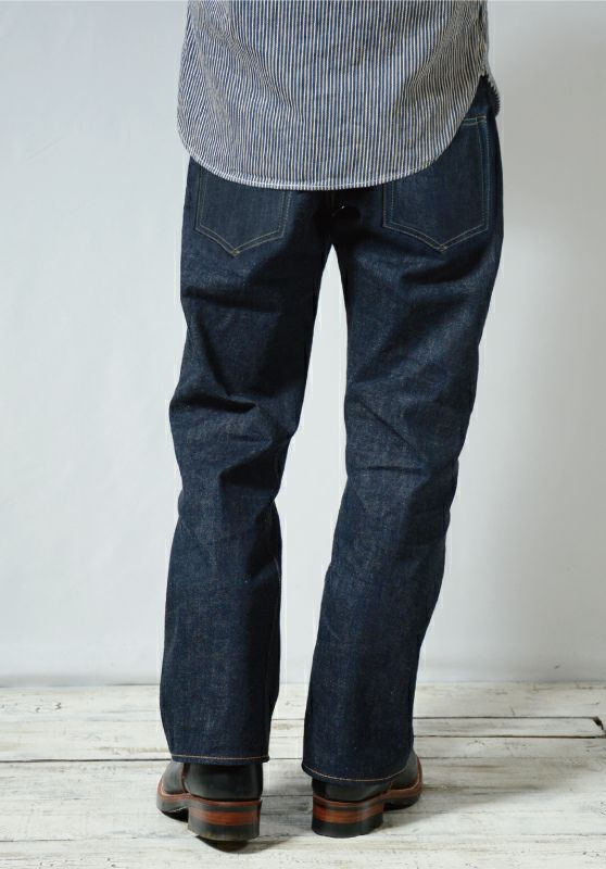 岡山県井原でオリジナル製造した13.6オンスデニムを使用。ヴィンテージデニムの進化を謳ったこのジーンズは、スタイリッシュシルエットに加え立体裁断により動き易く創られているほか股下の擦れ・穴開きに対する耐久性に優れた「長い着用」を見込めるジーンズです。また「再現」と呼ぶオリジナルデニムは1940年代のヴィンテージデニムを彷彿する色落ちと質感が特徴です。