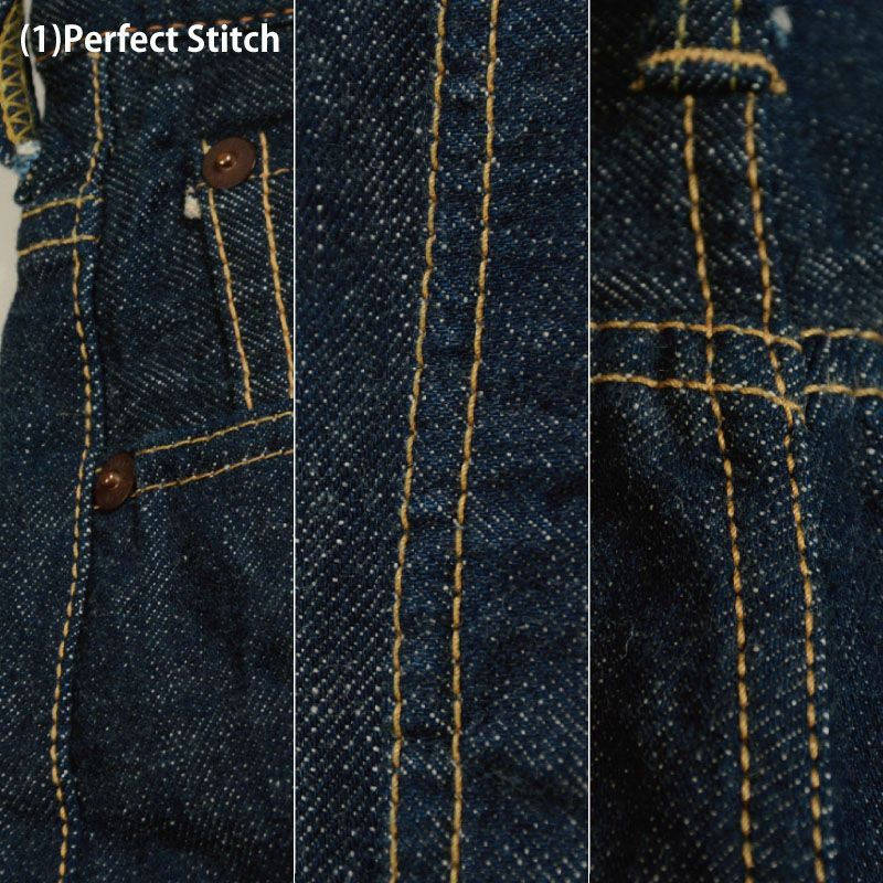 パーフェクトステッチとは、縫製に使用する糸の使い方と縫い方を表した表現。19種類の縫製糸を使用し、場所に応じて縫製糸と縫い幅(3cm間のミシン針数)を変えたヴィンテージを超えたオリジナルステッチ。衣料が100年残り続けるための条件ともいう。