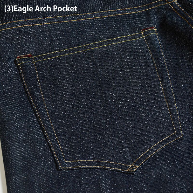 ジーンズの顔となるバックポケット。微かな歪みをリアルに再現したヴィンテージジーンズに寄った形と縫製方法が味わい。イーグルアーチポケット