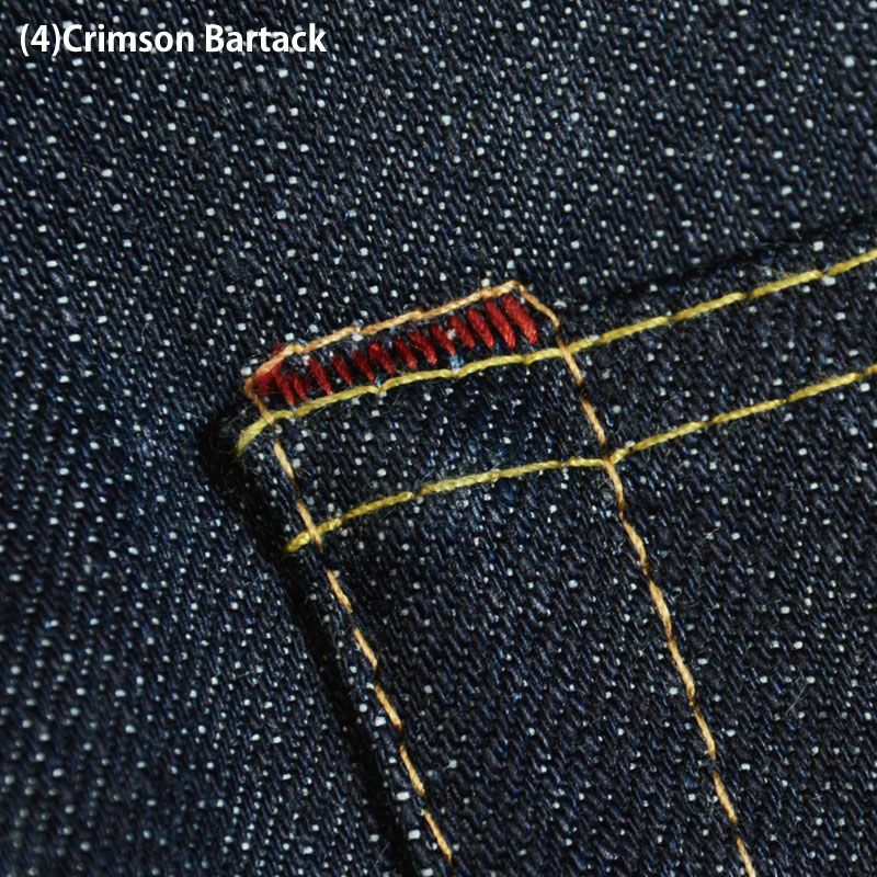 拘りのデニムを見分けるコツはバータックを確認する。ポケットと身生地の段差を平らに仕上げる技が強度を生み、長い着用に耐久する。クリムゾンバータック。