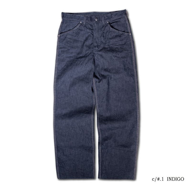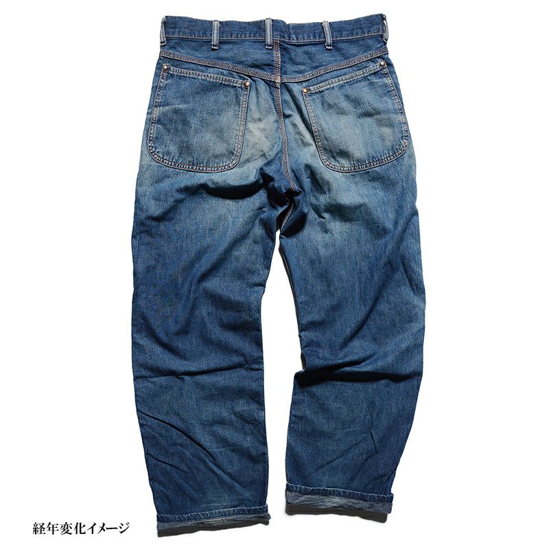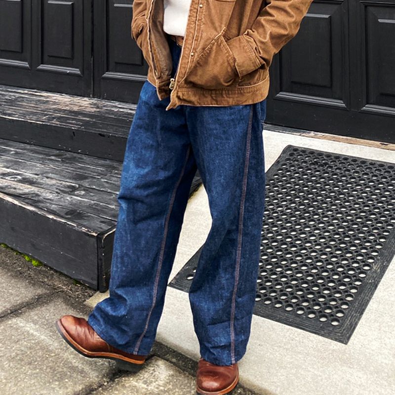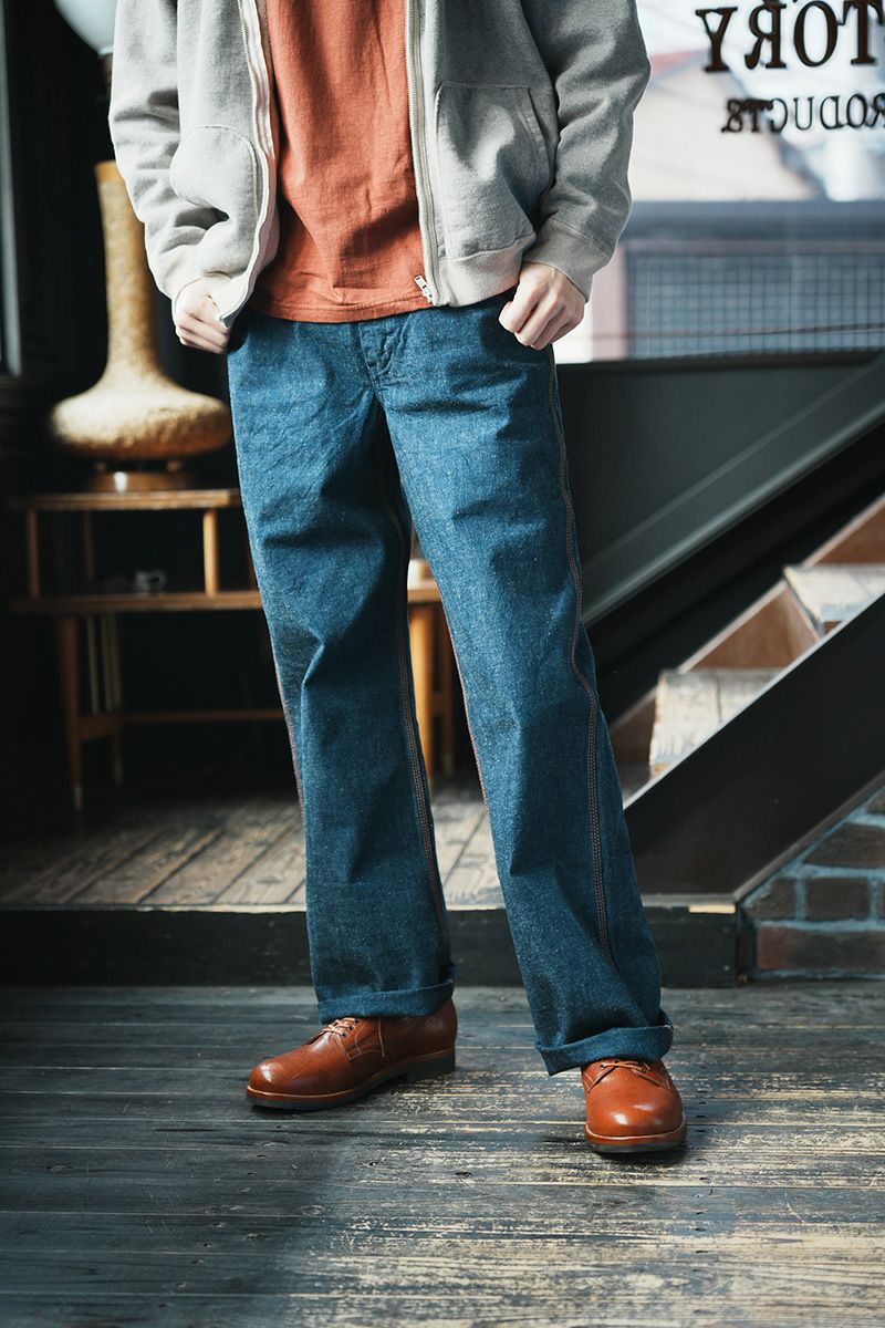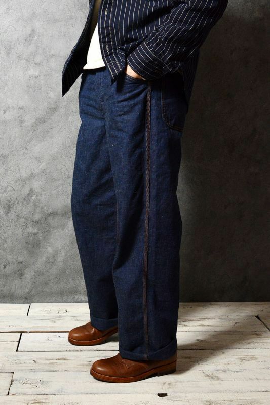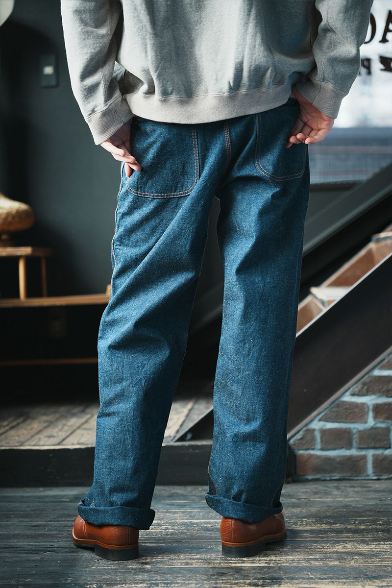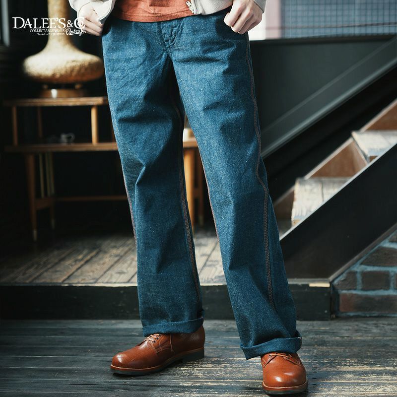 岡山県井原市の旧式シャトル織機で製造した10.5オンスデニム素材。柔らかな織糸で製造したことでデニム素材でありながら動き易い素材と、極太のストレートシルエットにより更に足の可動域を広げたダリーズ定番かつ人気のパンツ。 また、型紙に特殊な立体構造を適応し、正面より横から見たシルエットに太さが出るように創意工夫がなされている。