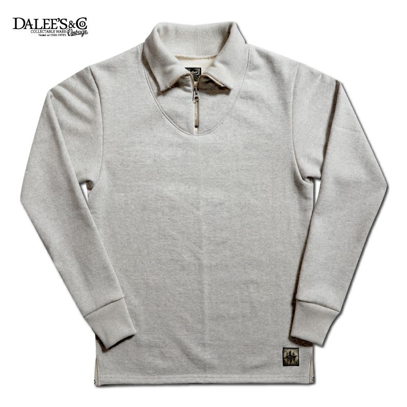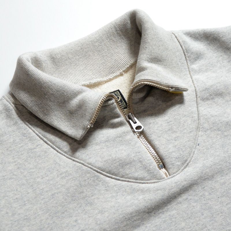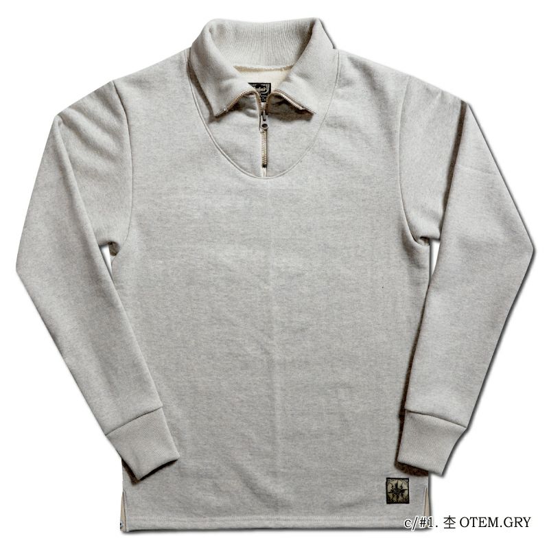 「もし1920年代にスウェットシャツのようなカットソーが存在したなら」と言う仮説により企画製造したモデルです。エリ元に重点を置く男性ファッションの風潮を反映したエリ・前立てスタイルと、1枚着でも見せられる杢オートミール素材と創り込み、着こなしによる変わるフィット感を調整する目的で付けられたサイド調整フラップなど、ありそうで無かった仕様が面白い1着です。