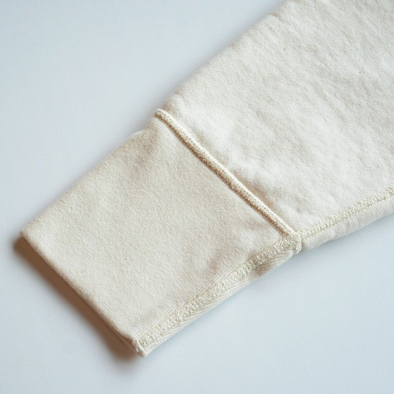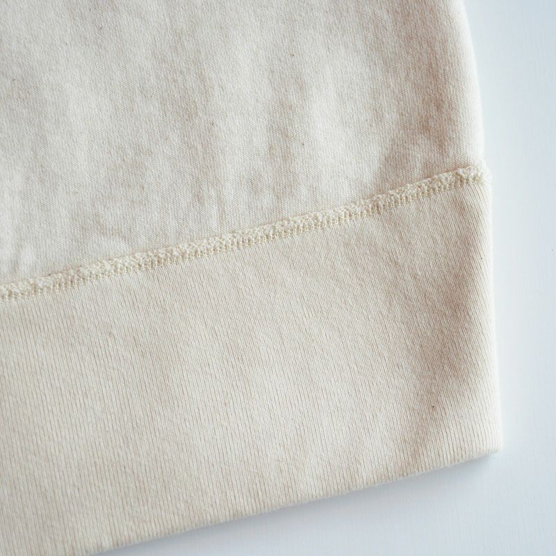 和歌山にて旧式吊編機により製造する吊裏毛素材。本来この旧式編機は「フワフワに柔らかく空気を含むように編み上げる特徴」を持ち、旧式編機らしく「柔らかく保温性に富んだ」素材に仕上げました。ローゲージにより空気の含有率が向上することでミディアムウエイトながら保温性を損なわずに編上げました。