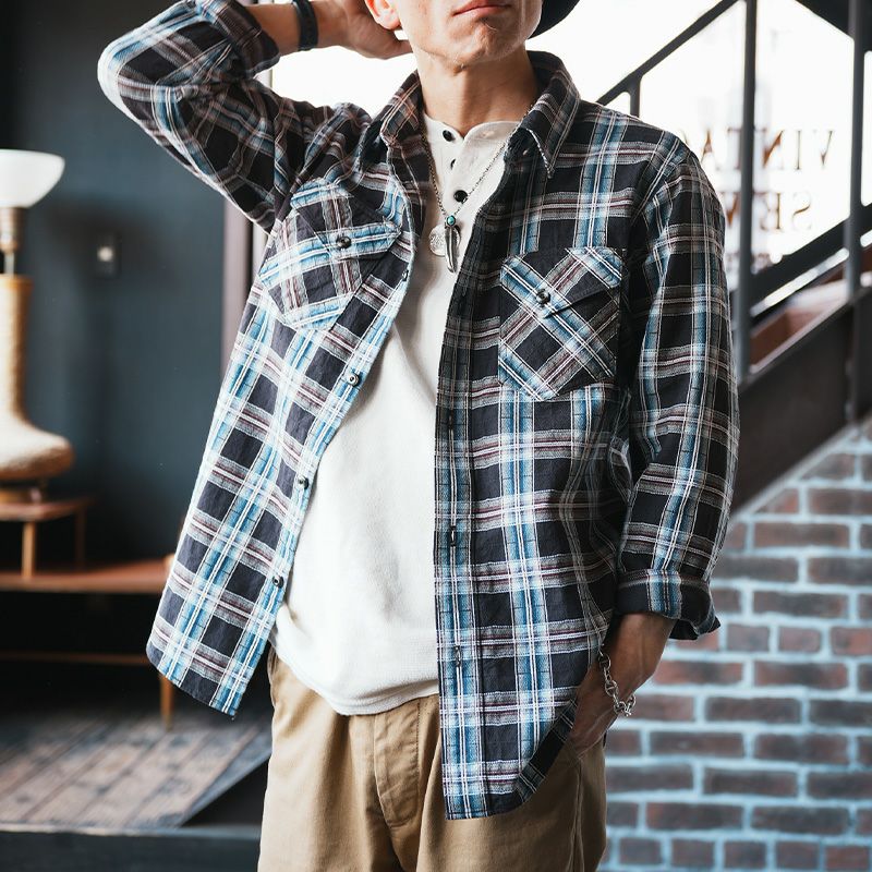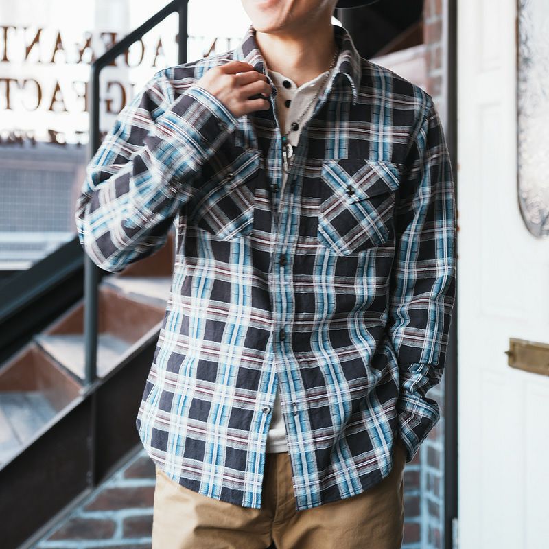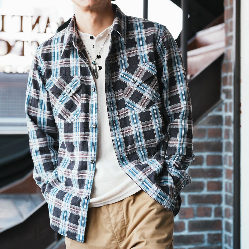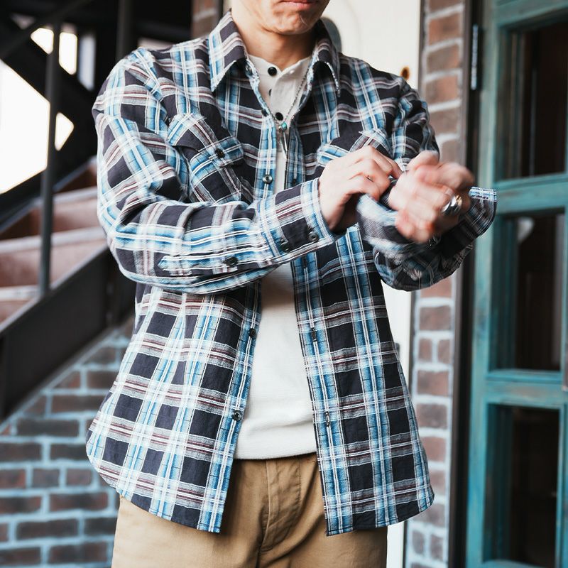 兵庫県西脇で製造したライトネル素材。厚すぎず薄すぎずの素材感は3シーズン対応の幅広い使いやすさが魅力です。オンブレ調のネイティブチェックは、旧式ドビー織機により特殊織りした複雑な組織と柄が特徴。無起毛の素材感により長いシーズン楽しめるシャツです。