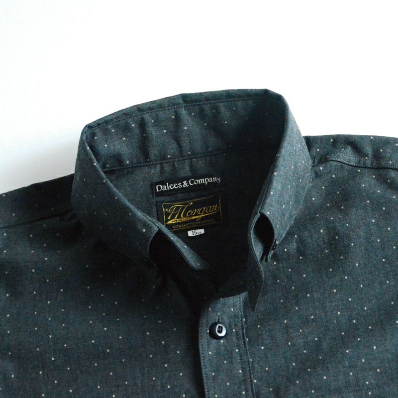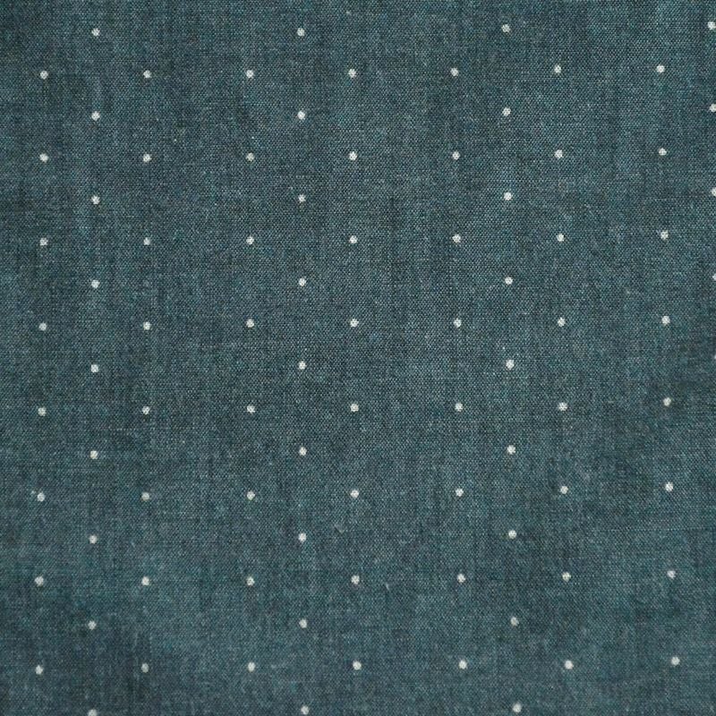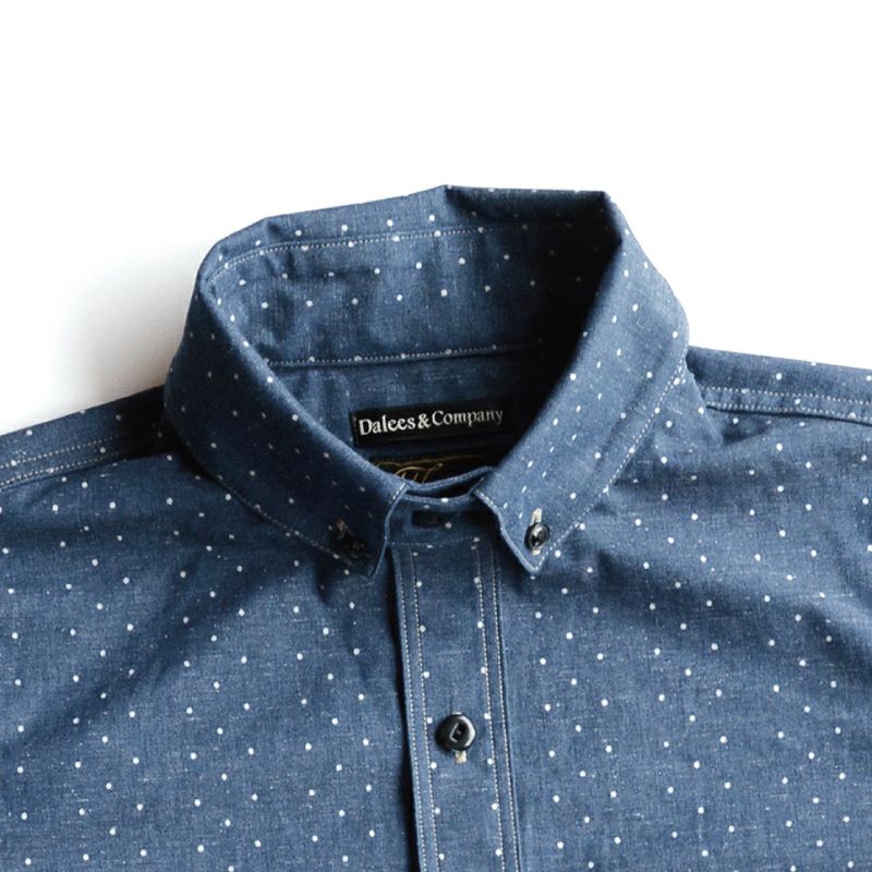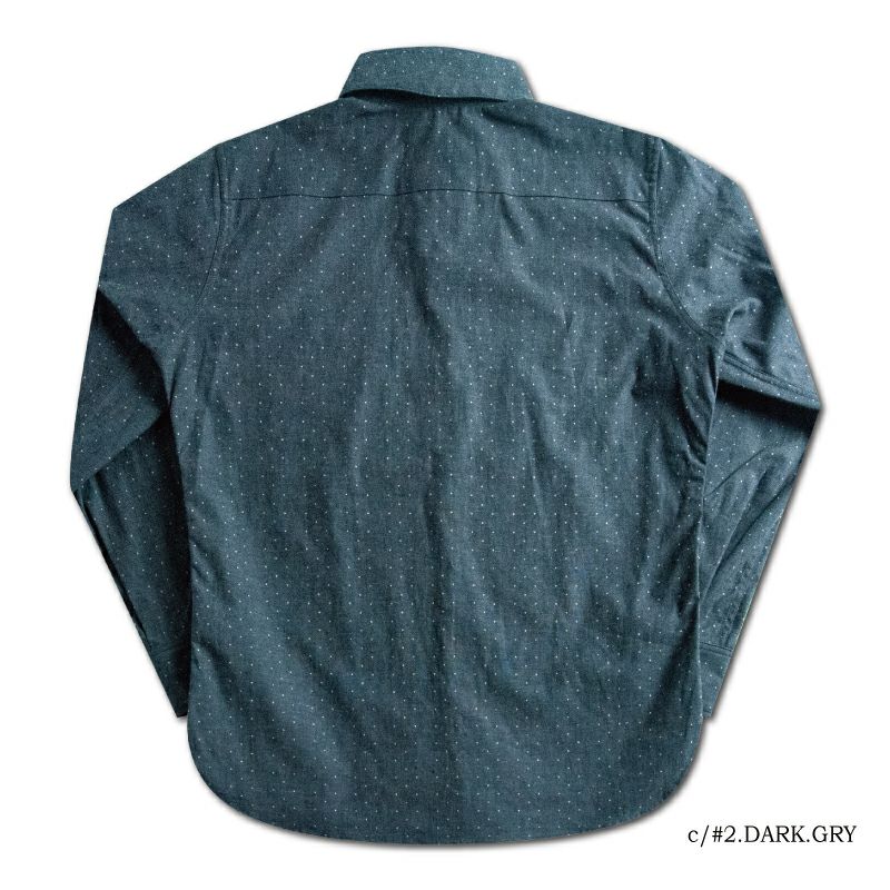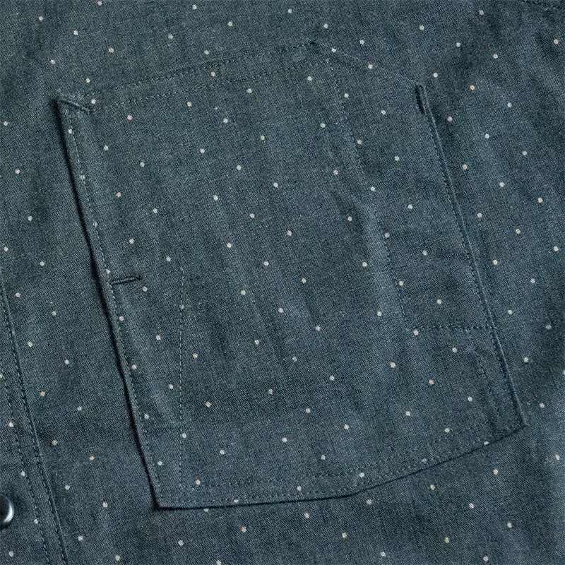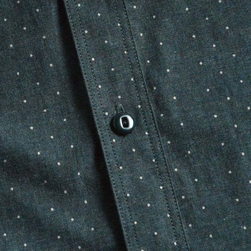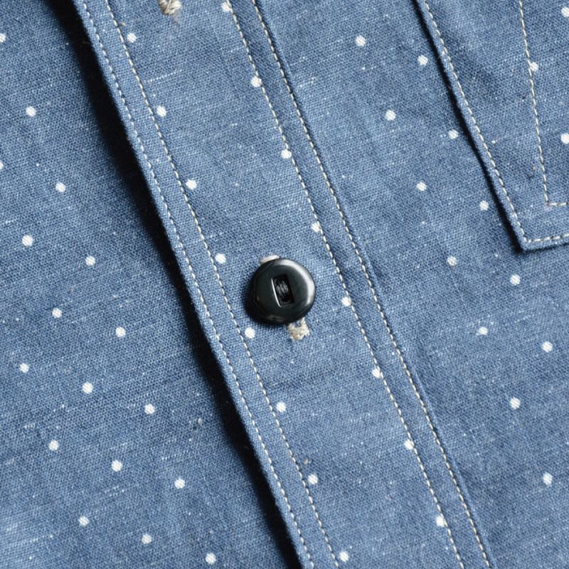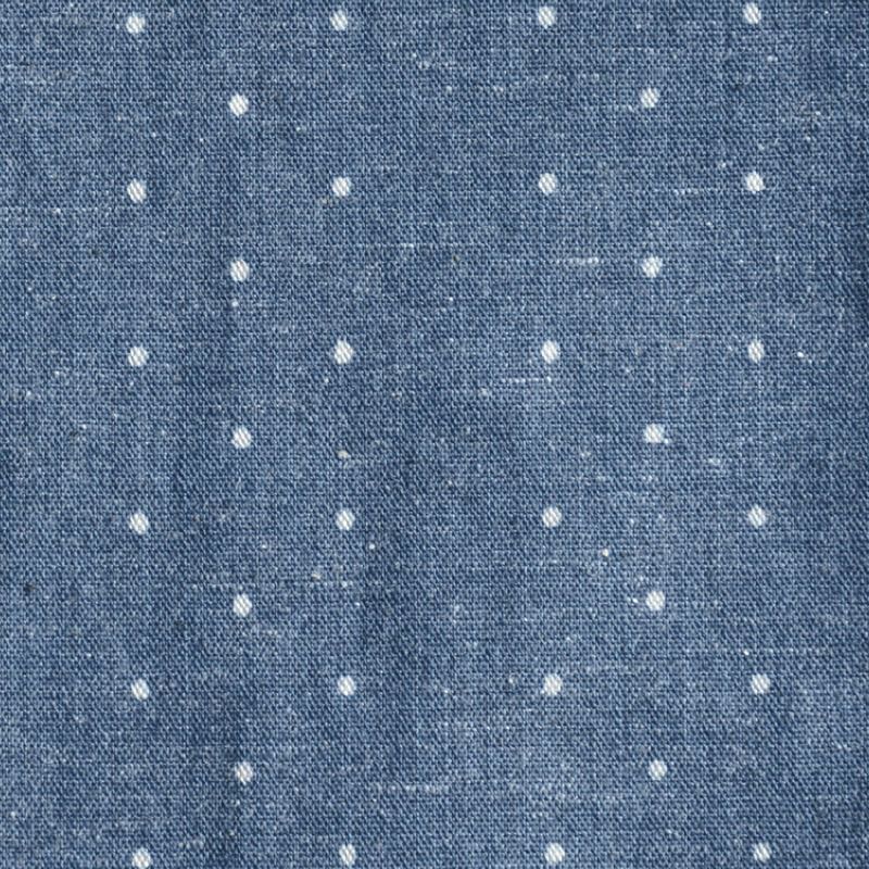 岡山県井原の旧式織機により創り上げたインディゴロープ染色とブラックシャンブレーの2素材にポルカドットをストライプ状に抜染した柄物シャンブレーです。経糸にインディゴロープ染色またはブラックロープ染色20番単糸を張り、緯糸には杢糸打ち込むことで製造する一風変わった色合いが特徴です。