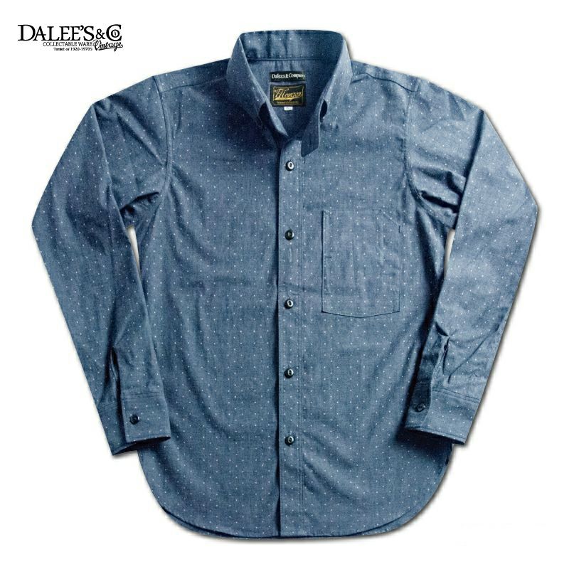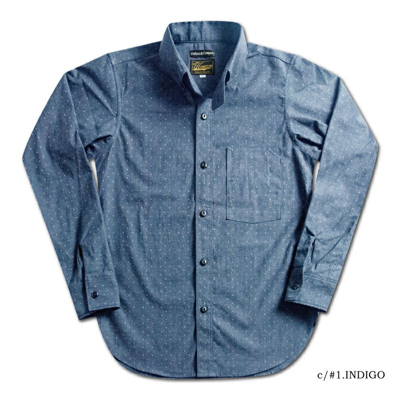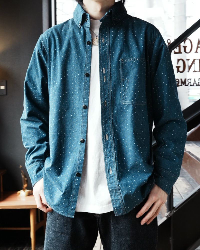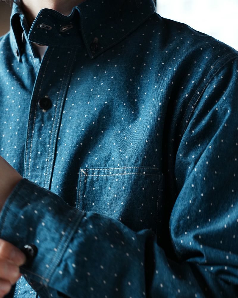 1920年のワーク&ドレスにより創造したレイルロードシャツ。ポルカドットをストライプ状に抜染したインディゴシャンブレーと高さのあるボタンダウンエリ形状、懐中時計など忍ばせる当時のポケットなど特徴を持つ一種独特のドレス&ワークシャツです。着込むたびに表情が変わる「育てる衣料」でもあります。