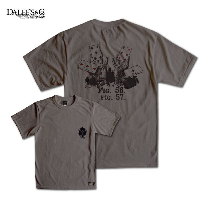 頭品番、サイズ感を同等にしながら素材やデザインが変更されて毎期発売されているダリーズのメインTシャツ。1900年代初頭のイメージを感じさせるデザインソースは、1世紀前のタッチや絵画技法そして書体など、現代では歴史に消えたとされる実在のモノがベースです。この時代にTシャツなど存在していないものの、色合い、デザインで表現するTシャツ=カンバスという思考により企画します。デザイン柄に引き込まれ、其々の個性を発揮し、古い時代のアートカンバス素材としてTシャツ以外の価値をも見出して頂けたなら本望です。プリントデザインに採用したギャンブルカード柄は1800年に実在したモノ。当時はカードに税金を設け一般ギャンブルを抑制していたようですね。