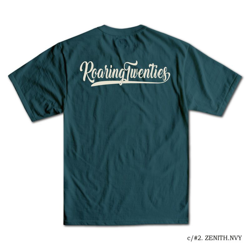 和歌山の旧式吊編機により、ゆっくり空気を含みながら編み上げたオリジナルの丸胴生地。凸凹のムラ糸表面をガスバーナーで焼き、毛羽を焼却したガス焼きスラブ天竺素材です。至高の着心地とサラリとした手触りそして横に走る凹凸感が雰囲気抜群のTシャツ。2022年春夏期中特別プリントは狂騒の1920年「ROARING TWENTIES」