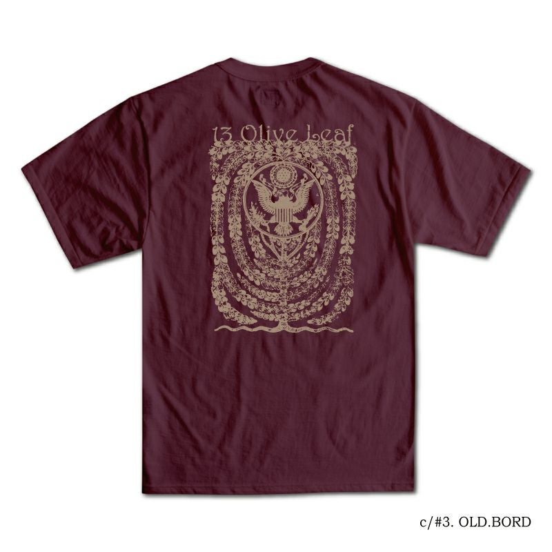 和歌山の旧式吊編機により、ゆっくり空気を含みながら編み上げたオリジナルの丸胴生地。凸凹のムラ糸表面をガスバーナーで焼き、毛羽を焼却したガス焼きスラブ天竺素材です。至高の着心地とサラリとした手触りそして横に走る凹凸感が雰囲気抜群のTシャツ。プリントは1920年の平和の象徴「OLIVE」。
