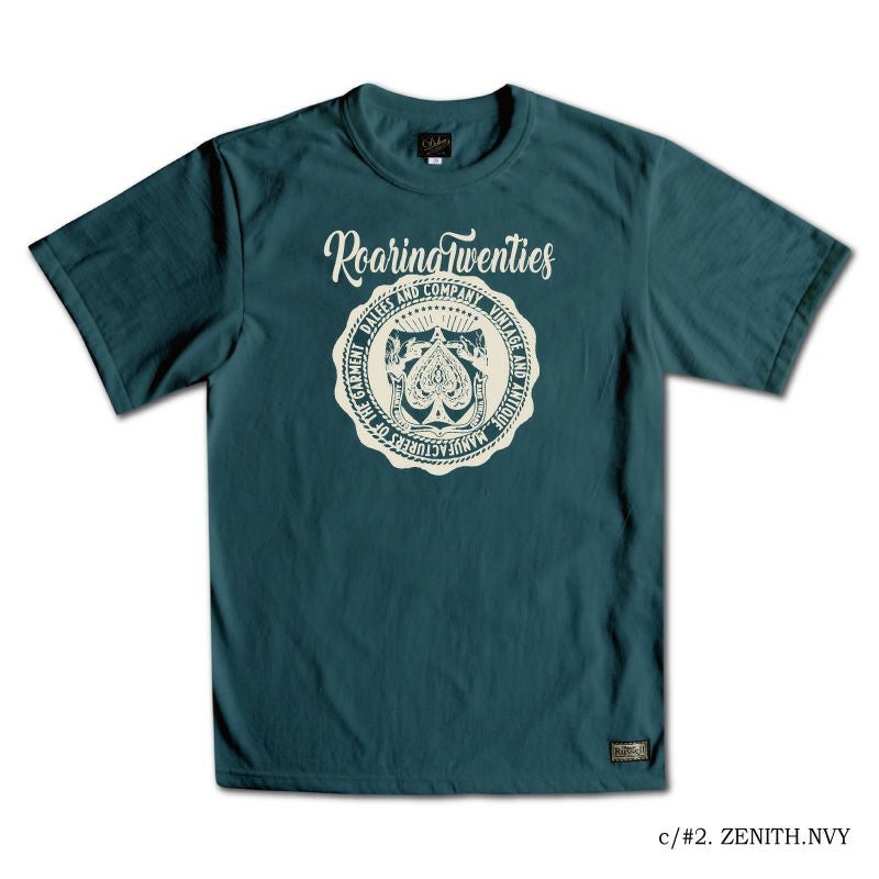 頭品番、サイズ感を同等にしながら素材やデザインが変更されて毎期発売されているダリーズのメインTシャツ。1900年代初頭のイメージを感じさせるデザインソースは、1世紀前のタッチや絵画技法そして書体など、現代では歴史に消えたとされる実在のモノがベースです。この時代にTシャツなど存在していないものの、色合い、デザインで表現するTシャツ=カンバスという思考により企画します。デザイン柄に引き込まれ、其々の個性を発揮し、古い時代のアートカンバス素材としてTシャツ以外の価値をも見出して頂けたなら本望です。2022年春夏期中特別プリントは狂騒の1920年「ROARING TWENTIES」。