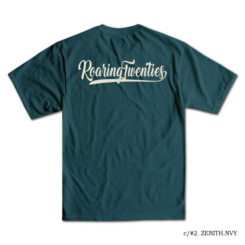 和歌山の旧式吊編機により、ゆっくり空気を含みながら編み上げたオリジナルの丸胴生地。凸凹のムラ糸表面をガスバーナーで焼き、毛羽を焼却したガス焼きスラブ天竺素材です。至高の着心地とサラリとした手触りそして横に走る凹凸感が雰囲気抜群のTシャツ。2022年春夏期中特別プリントは狂騒の1920年「ROARING TWENTIES」