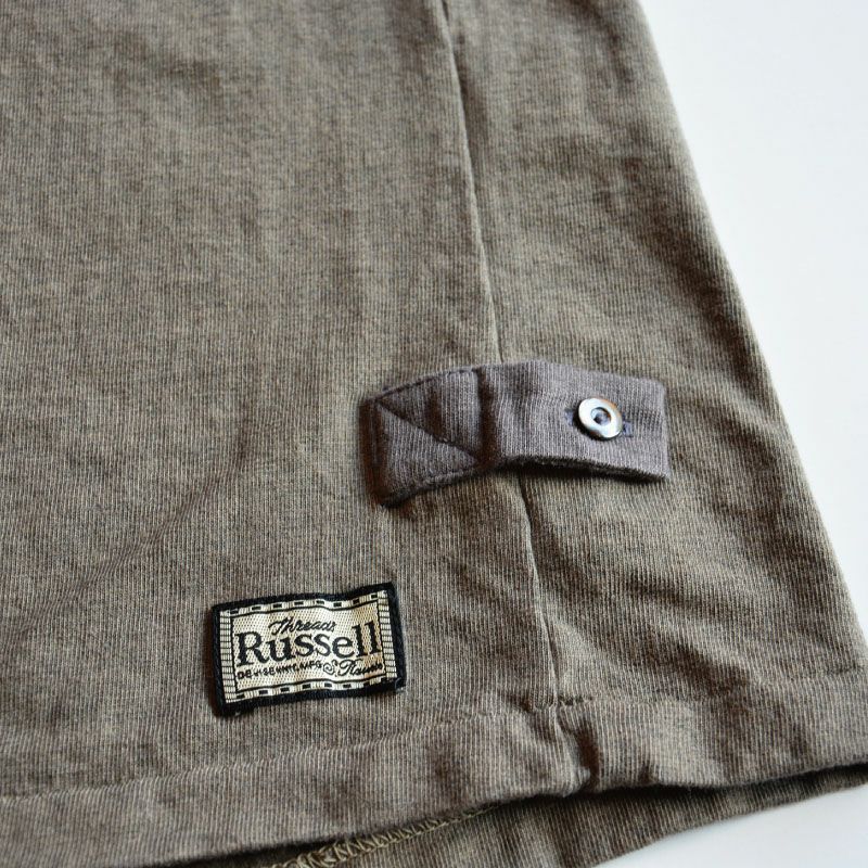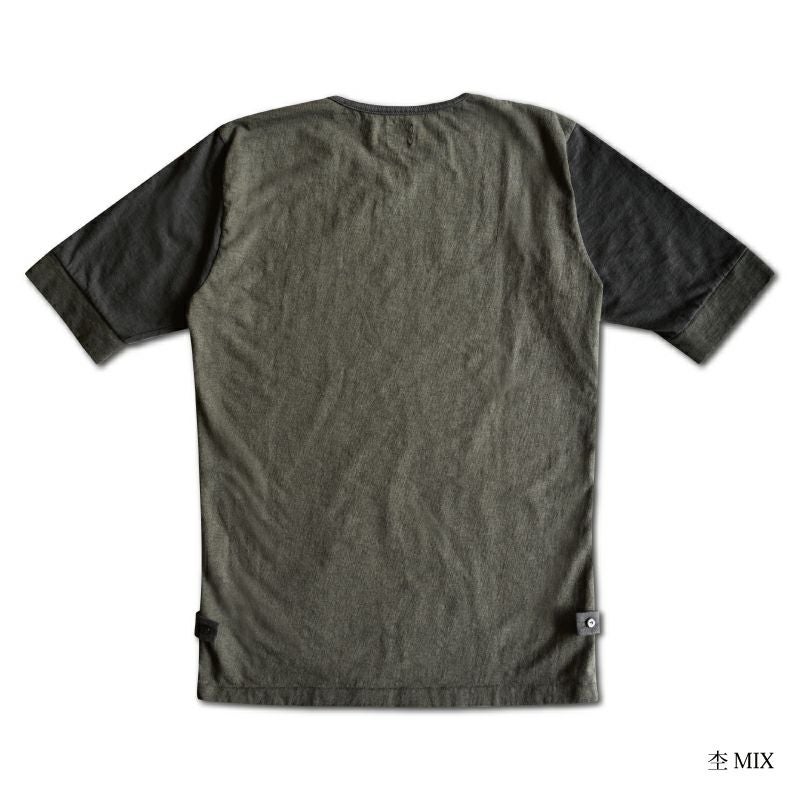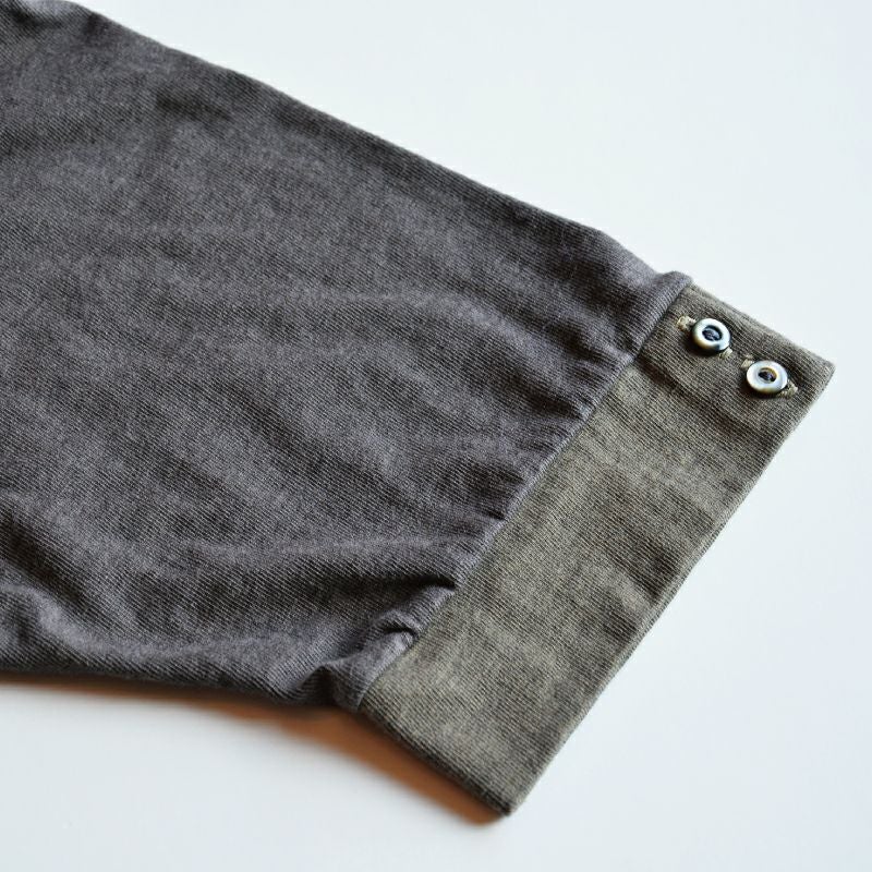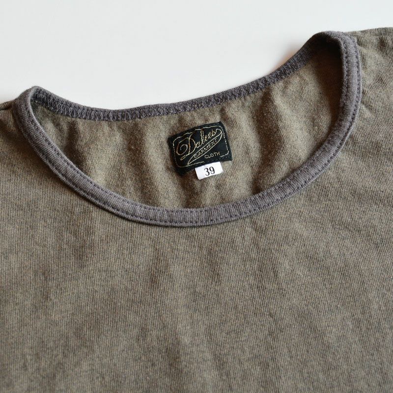 2019年春夏コレクションで展開するガス焼き天竺。和歌山の旧式吊編機の使用はもちろんことですが、編立を行う前に「16番の編糸表面を糸の段階でガスバーナーで焼く」ことで毛羽を焼き切り、特段の肌触りと毛玉を防止したオリジナル吊天竺です。首元が広いワイドネック形状と肘までの袖丈「エルボースリーブ」により一種独特の形状を創り上げています。一枚着でも重ね着でも使い勝手が良いことからダリーズTシャツシリーズ中で最もリピート率が高い商品です。