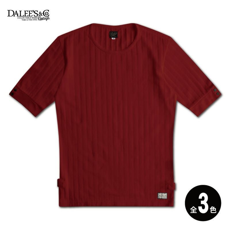 変形ピケ編みというデザイン性あるニット素材。首元が広いワイドネック形状と肘までの袖丈「エルボースリーブ」により一種独特の形状を創り上げています。一枚着でも重ね着でも使い勝手が良いことからダリーズTシャツシリーズ中で最もリピート率が高い商品です。