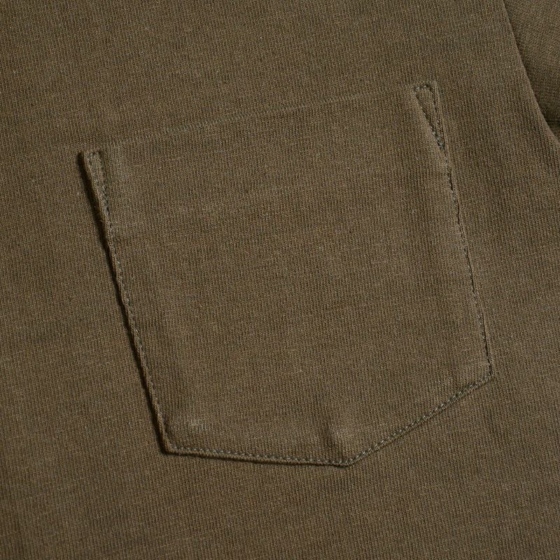 オリジナル製造した10ozラフィーコットン極厚天竺。和歌山の旧式吊編機を使用し、この編み機限界密度によってラフィー10番単糸を2本引き揃えて編み上げた強ムラ・極厚・しなやかな質感が特徴。