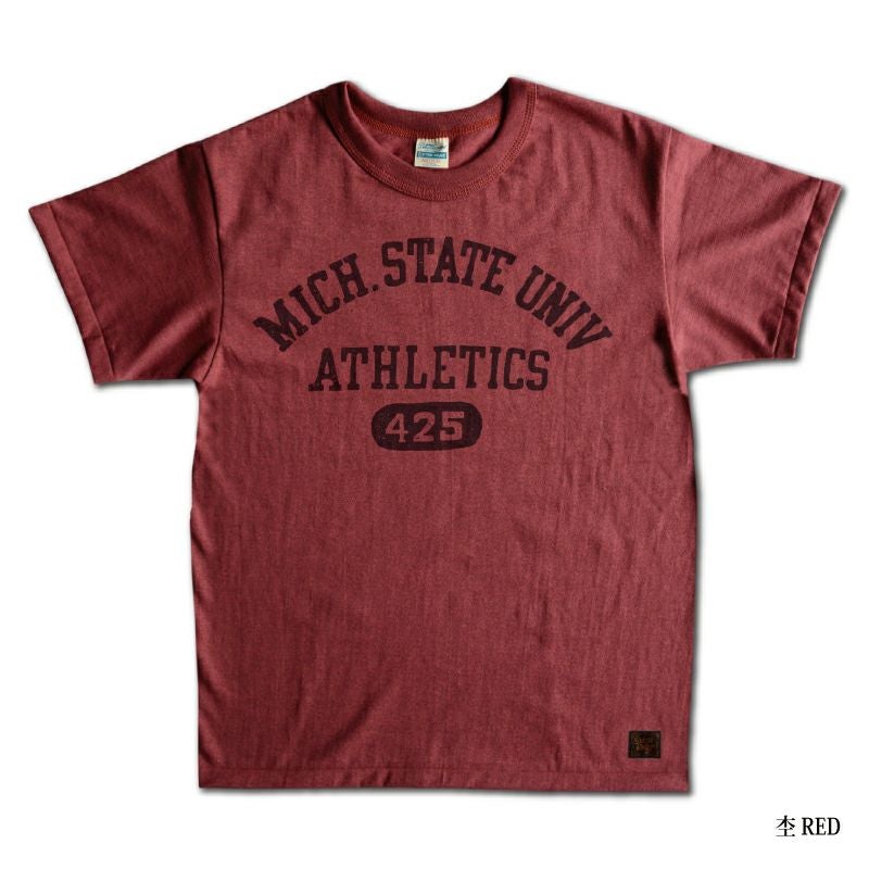 1960年代後半にアメリカで流通したTシャツ。吊編機で製造されたその素材は「薄くペラペラの厚さ」と「チープな雰囲気」が何かカッコよさを持っていました。そのチープなカッコ良さを「少しばかり品質向上したら」という企画で製造した素材がこの2018年から新登場し2019年も展開するガス焼き吊天竺です。ですから、プリントデザインも1960年代後半を彷彿するような柄を製作しています。「色落ちしたジーンズにヤレて少しくたびれた雰囲気の丈夫なTシャツスタイル」これがこのMTGシリーズが目指すところです。プリントは1960年代を思わせるカレッジデザイン。透明染料と言う、現代技術プリントを使用し独創的かつ雰囲気抜群の仕上がりになりました。