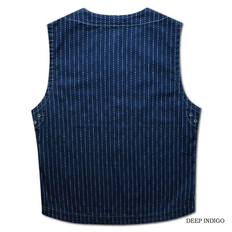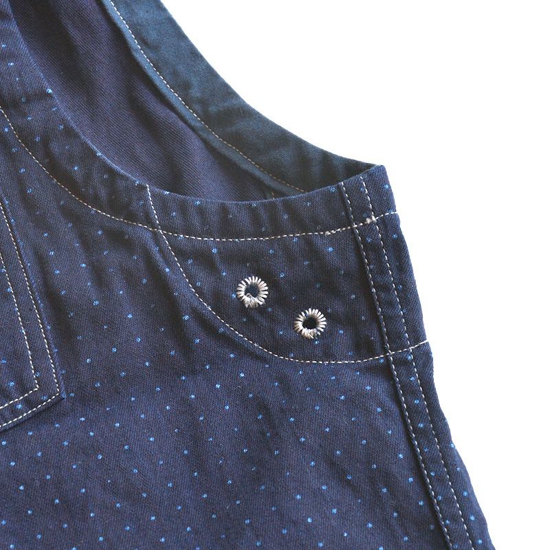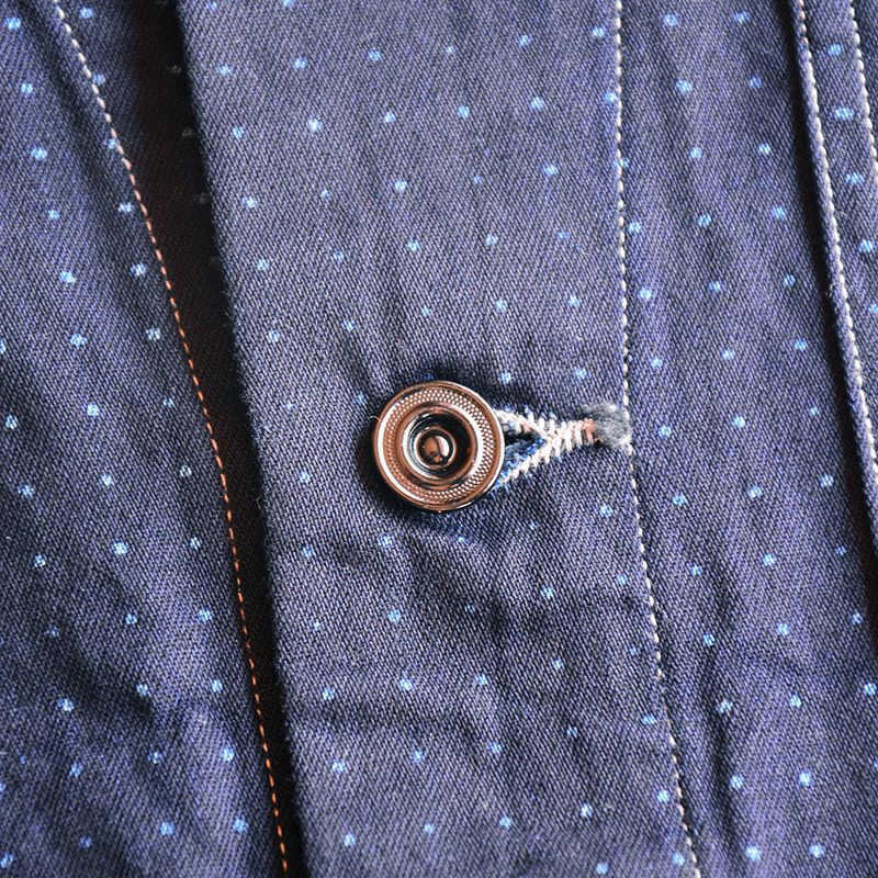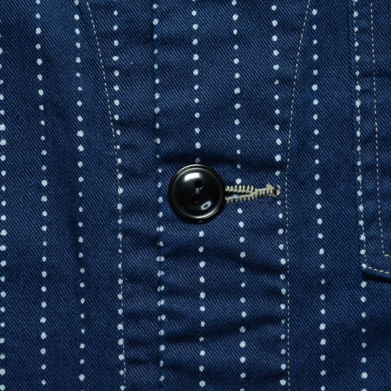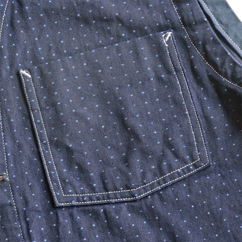 インディゴファブリックに手書き六角形ドットをストライプ状に抜染したウォバッシュ柄が特徴です。6.8オンス程度のシャンブレー素材として軽くて丈夫なうえ、インディゴ特有の経年変化も楽しめるオリジナル素材です。