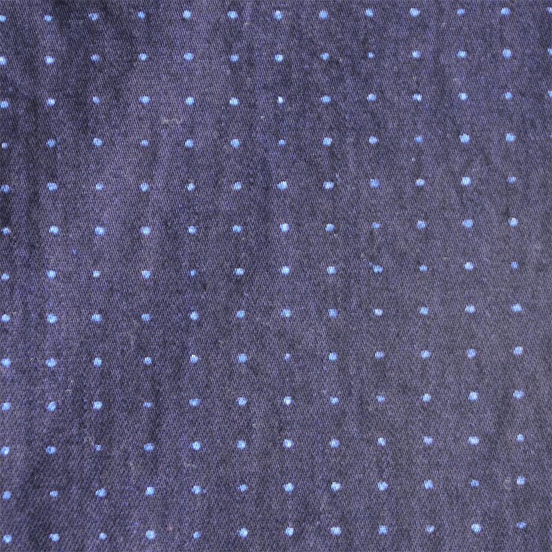 紺ピュアインディゴ染色糸を経緯糸に使用した特濃インディゴ生地からグノモンドットを抜染し、その後にベージュ染めした二重染めオリジナルデニムです。