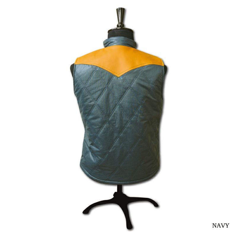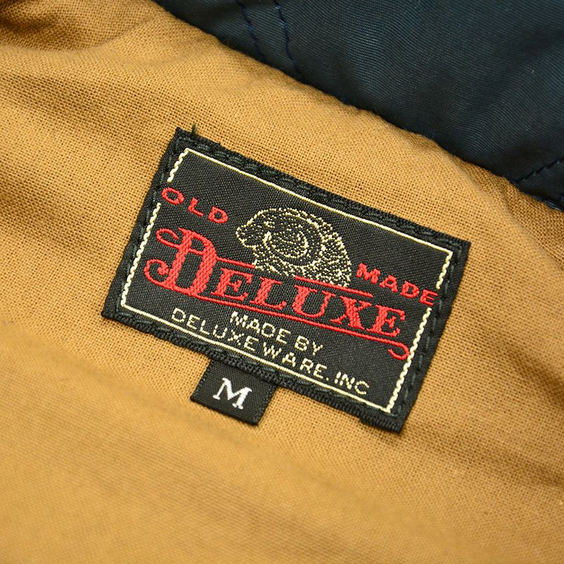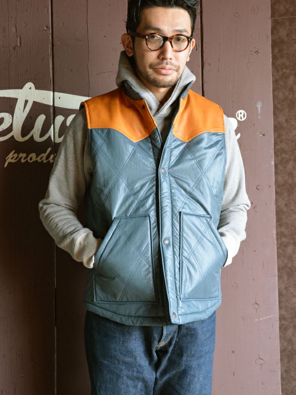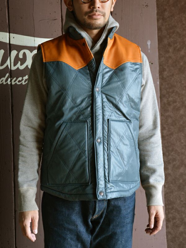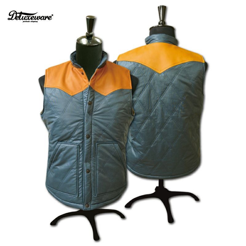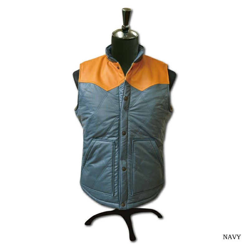 デラックスウエア初のオリジナルナイロンプロダクツ品。織糸からオリジナルで開発製造した特殊ナイロン素材と極厚コットン中綿を使用したナイロンベスト。また、肩ヨークにはレザーを施しデザイン性と強度向上を図りました。重厚な質感と高い保温性により、シャツやパーカー等との着合わせをロングシーズン楽しめる商品です。