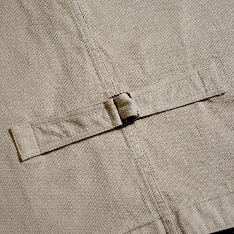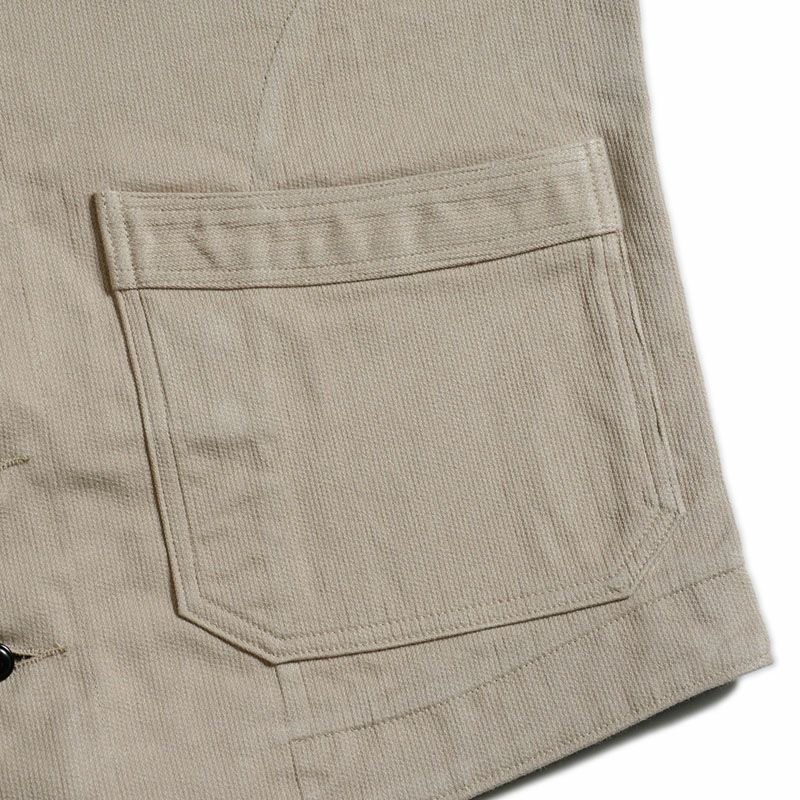 兵庫県西脇の旧式ドビー織機を使用し詳細な創り込みで製造したオリジナルピケ素材。経糸に20番糸と40番糸を使用し2種類の織り糸(2本の糸を撚り合わせた通常撚糸と限界まで撚りを強めた限界強撚糸)を交互に「6本並べて1本抜き」を生地幅まで繰り返し、緯30番単糸を打ち込んで製造した芸術的なピケ素材。限界強撚糸が通常撚糸を抑え、独特の生地表情が生み出されたことから「スワローピケ」と称しています。