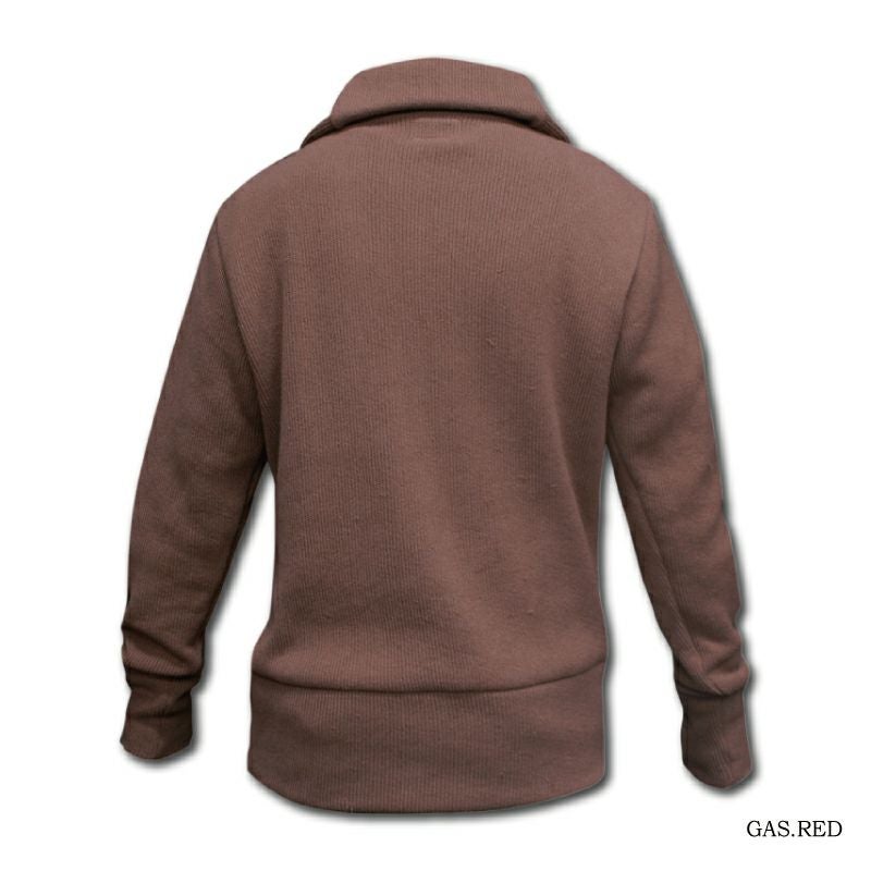 国内最厚を誇る両面編みコットンニット。表地6本撚り6色、裏地に2本撚り2色にて仕上げた多色多重撚杢糸が特徴。多色の撚杢にて仕上げたニット生地表情は、近寄る程にその奥深さが感じ取れます。ボタン止め位置にて襟の形状をコントロールするオリジナルネック。全てボタン止めするとハイネックハイトとして首元を演出・保温出来ます。