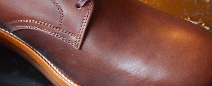 「キップレザー」と呼ばれるキメ細かな子牛革に、パラフィン蝋、蜜蝋を含浸させた蝋レザーをオリジナル製造。使用上の傷や汚れに強く、履き込む程、手入れする程にツヤが生まれる特殊レザーである。まさにブーツに相応しいタフなレザーとして仕上がった。