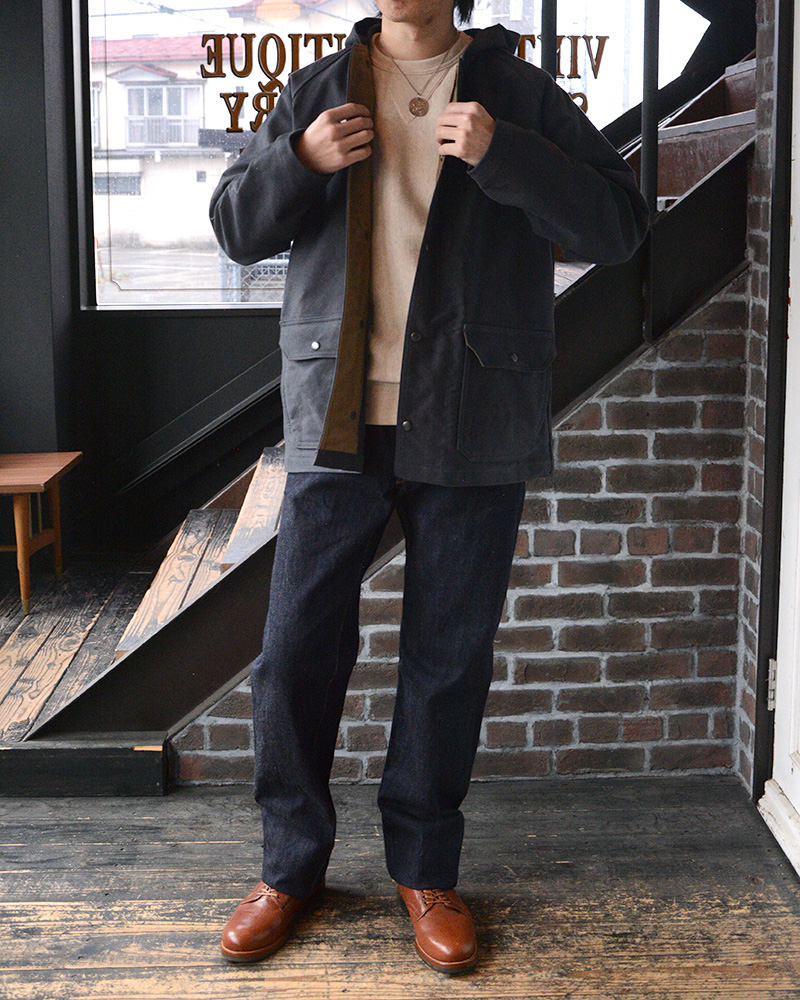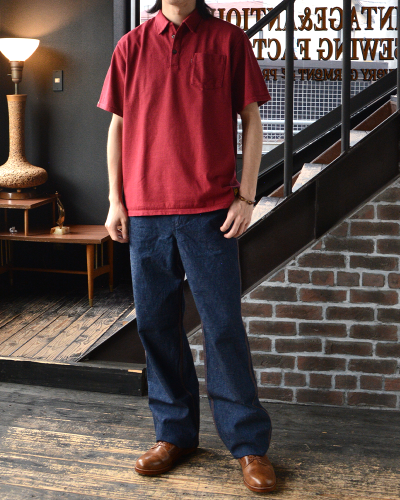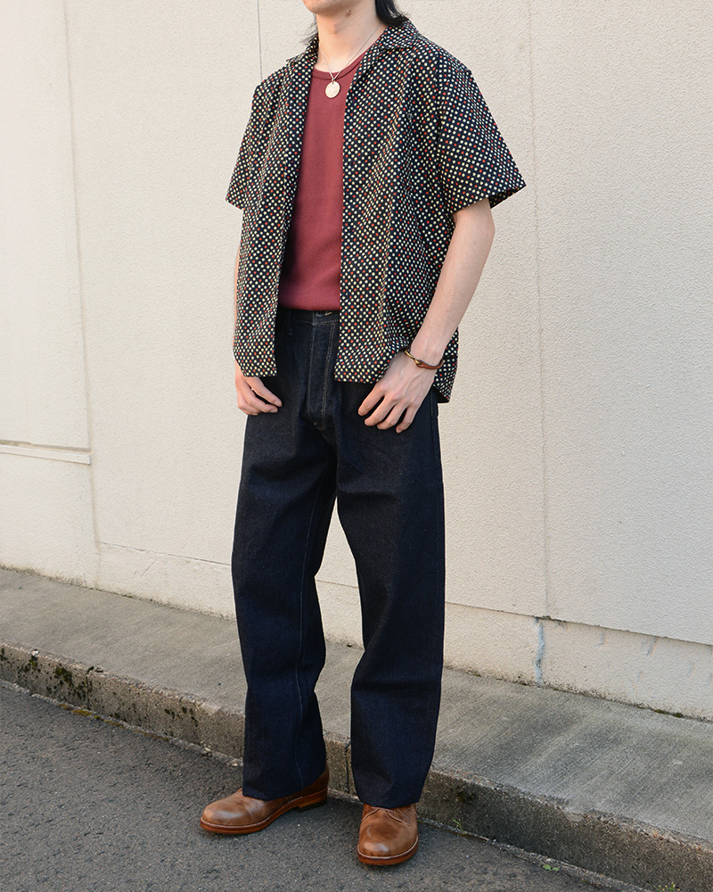 今の季節でも着られるオリジナルスルーファブリック生地の、1920sスタイルワークシャツを使用した春夏コーデ。